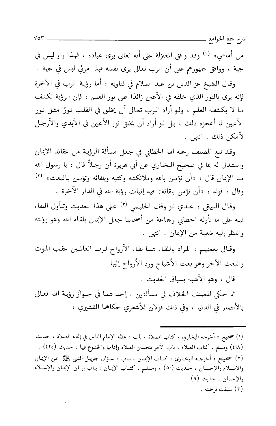 وَقَدْ تَبِعَ المُصَنِّفُ رَحِمَهُ اللَّهُ الخطَّابِيَّ فِي جَعْلِ مسأَلةِ الرّؤيةِ مِنْ عقَائدِ الإِيمَانِ وَاستدلَّ لَهُ بمَا/ (٢٣٤/أَ/م) فِي صحيحِ البخَاريِّ، عَن أَبِي هريرةَ أَنَّ رجلاً قَالَ: يَا رسولَ اللَّهِ مَا الإِيمَانُ؟ قَالَ: ((أَنْ تُؤْمِنَ بَاللَّهِ وَمَلَاَئِكَتِهِ وَكُتُبِهِ وَبِلِقَائِهِ وَتُؤْمِنَ بِِالْبَعْثِ)) وقَالَ: قَوْله: ((أَنْ تُؤْمِنَ بِلْقَائِه)) فِيهِ إِثبَاتُ رؤيةِ اللَّهِ فِي الدَّارِ الآخرةِ.