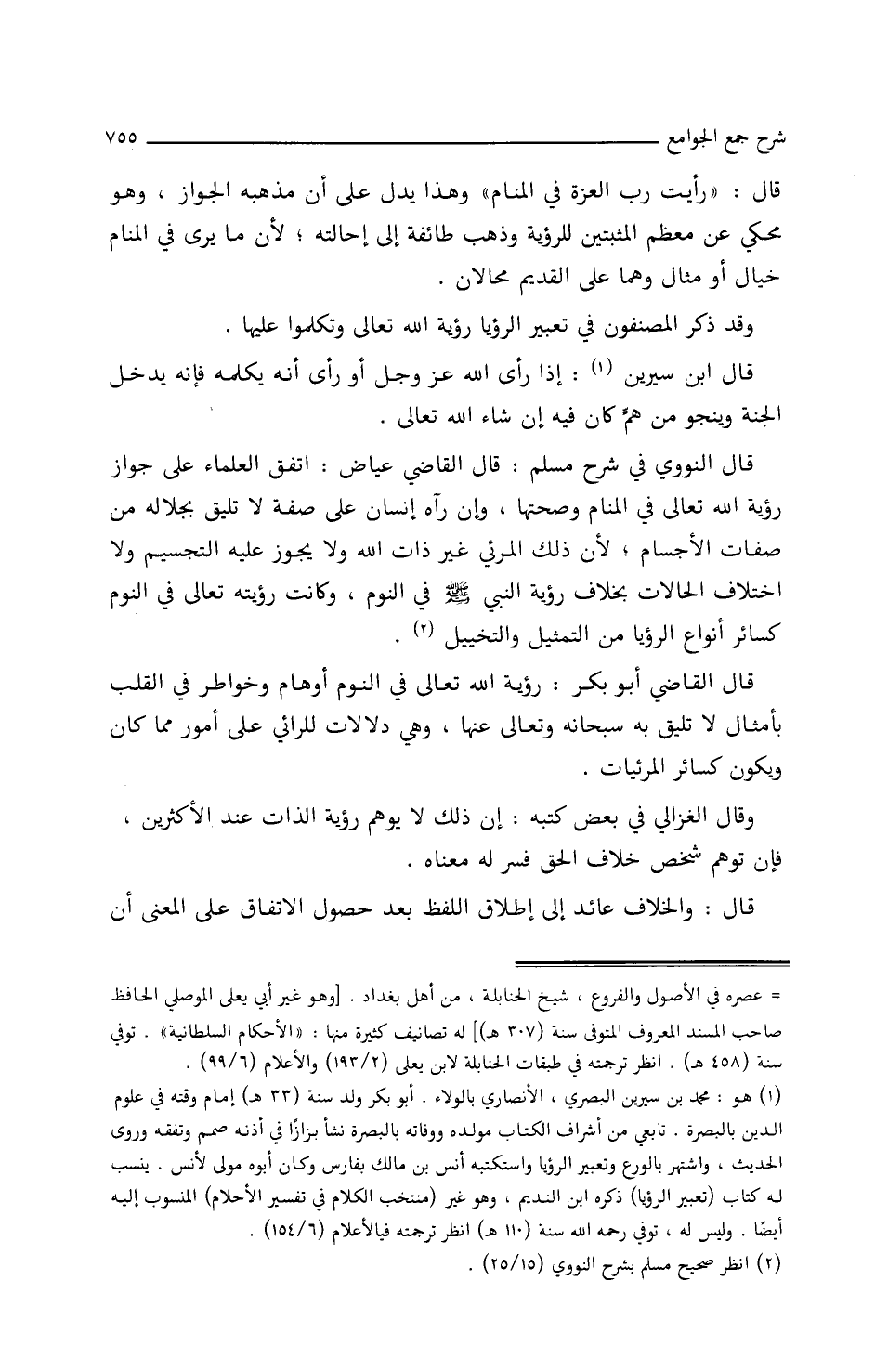 قَالَ: (رأَيْتُ رَبَّ العِزَّةِ فِي المَنَامِ) وهذَا يَدُلُّ علَى أَنَّ مذهبَهُ الجوَازُ، وهو/ (٢٣٤/ب/م) مَحْكِيٌّ عَنْ مُعْظَمِ المُثْبِتِينَ للرؤيةِ، وذهبَتْ طَائفةٌ إِلَى إِحَالتِه؛ لأَنَّ مَا يُرَى فِي المنَامِ خيَالٌ أَو مِثَالٌ، وهُمَا علَى القديمِ مُحَالانِ.