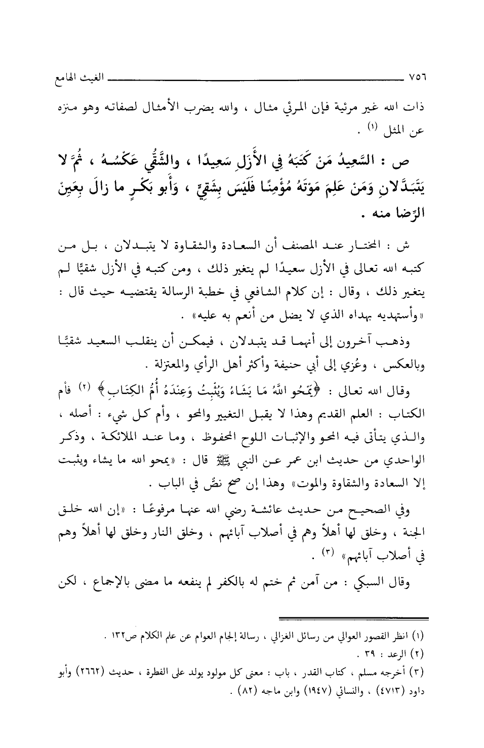 وقَالَ اللَّهُ تعَالَى: {يَمْحُو اللَّهُ مَا يشَاءُ/ (٢٣٥/أَ/م) وَيُثْبِتُ وَعِنْدَهُ أُمُّ الْكِتَابِ} فأَمُّ الكتَابِ: العِلْمُ القديمُ، وهذَا لاَ يَقْبَلُ التغييرُ وَالمحوِ، وأَمُّ كلِّ شيءٍ: أَصلُه، وَالذي يتأَتَّى فِيهِ المحوُ وَالإِثبَاتُ اللّوحُ المحفوظُ، ومَا عِنْدَ الملاَئكةِ، وذَكَرَ الوَاحِديُّ مِنْ حديثِ ابْنِ عُمَرَ عَنِ النَّبِيِّ صَلَّى اللَّهُ عَلَيْهِ وسَلَّمَ قَالَ: ((يَمْحُو اللَّهُ مَا يشَاءُ وَيُثْبِتُ إِلا السّعَادةَ وَالشّقَاوةَ وَالموتُ)) وهذَا إِنْ صَحَّ نصٌّ فِي البَابِ.