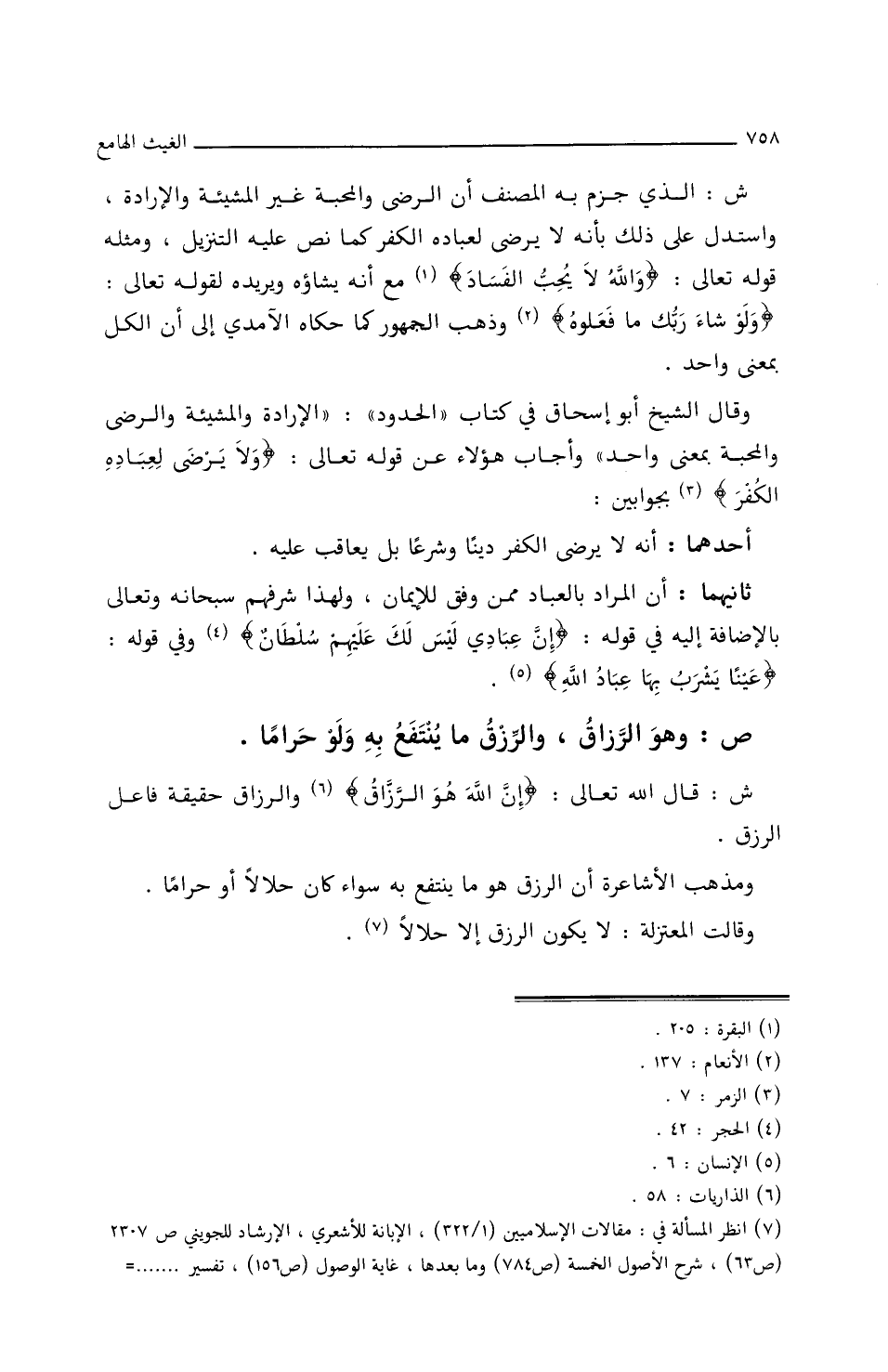 ش: الذي جَزَمَ بِهِ المُصَنِّفُ أَنَّ الرِّضَى وَالمَحَبَّةَ غَيْرُ المشيئةِ/ (٢٣٥/ب/م) وَالإِرَادةِ، وَاستدلَّ علَى ذَلِكَ بأَنَّهُ لاَ يرضَى لعبَادِهِ الكفرَ كَمَا نصَّ عَلَيْهِ التّنزيلُ، ومثلُه قَوْلُه تعَالَى: {وَاللَّهُ لاَ يُحِبُّ الفسَادَ} مَعَ أَنَّهُ يَشَاؤُهُ ويريدُه لقولِه تعَالَى: {وَلَوْ شَاءَ اللَّهُ مَا فَعَلُوهُ} وذَهَبَ الجُمْهُورُ كَمَا حَكَاهُ الآمِدِيُّ إِلَى أَنَّ الكلَّ بمعنَى وَاحدٍ.