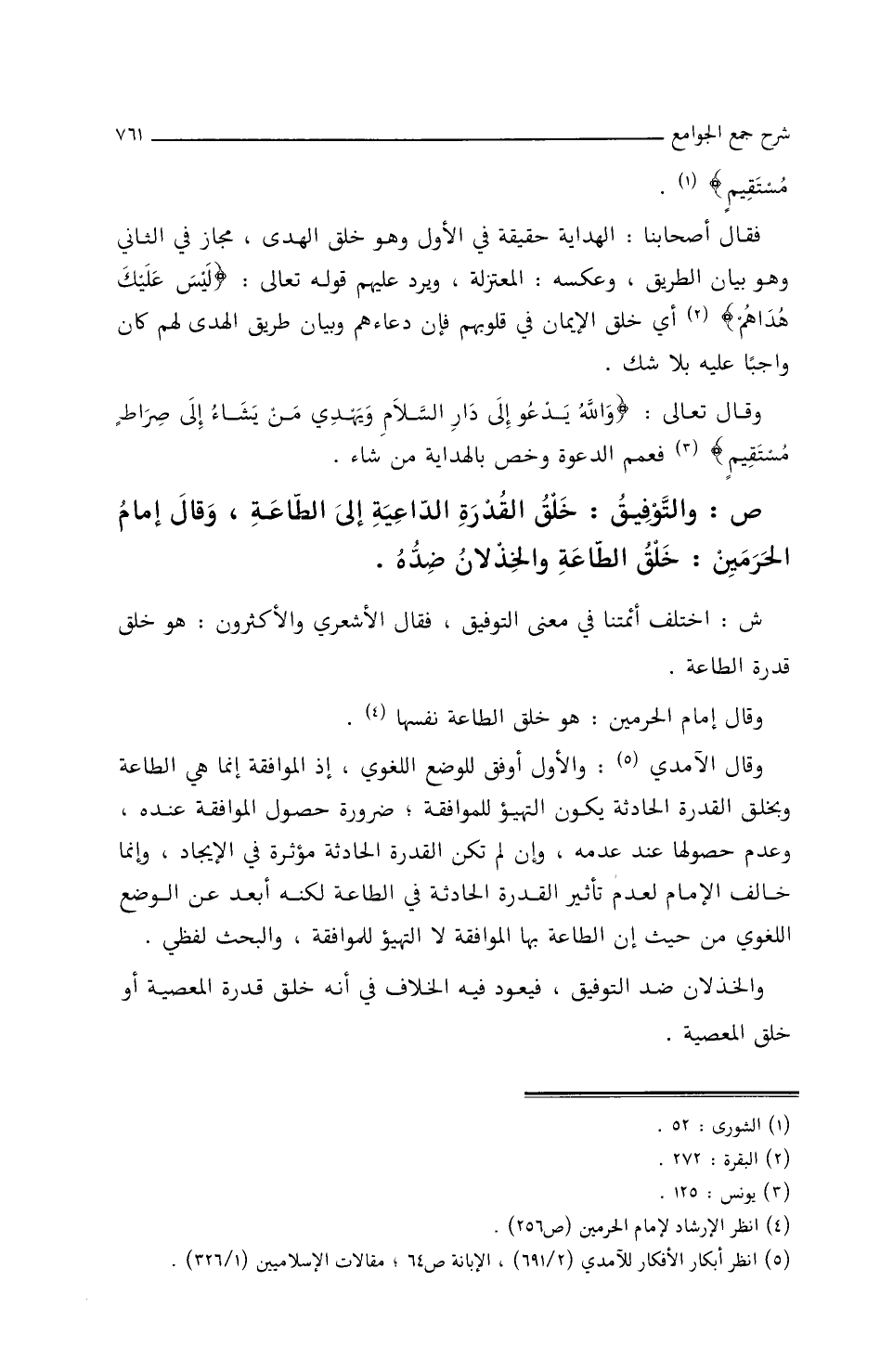 ش: اخْتلَفَ أَئِمَّتُنَا فِي معنَى التّوفِيقِ، فقَالَ الأَشعريُّ وَالأَكثرون: هو خَلْقُ قدرةِ الطَّاعةِ.