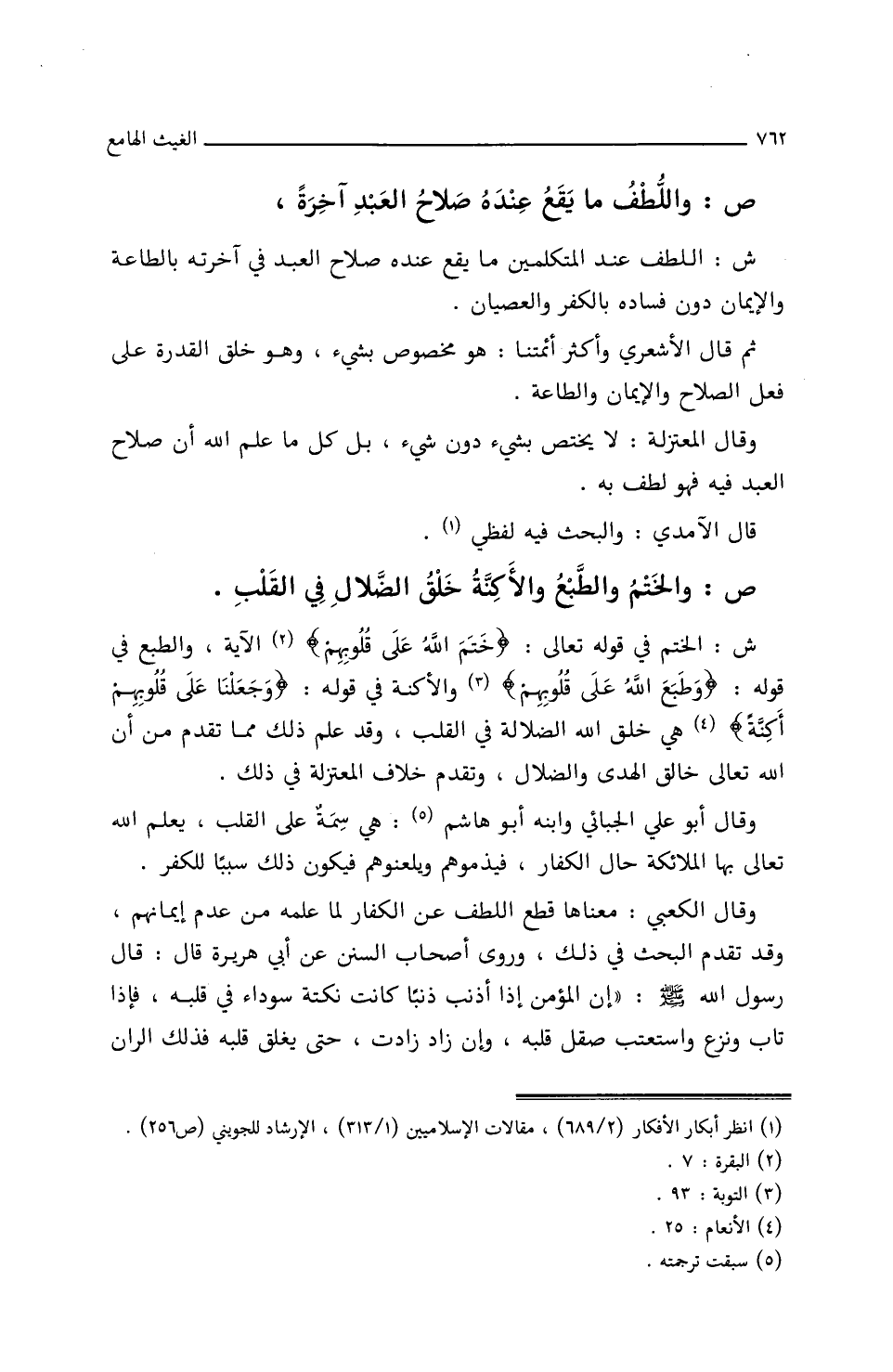 ص: وَالخَتْمُ وَالطَّبْعُ وَالأَكِنَّةُ خَلْقُ الضلالِ فِي القَلْبِ.