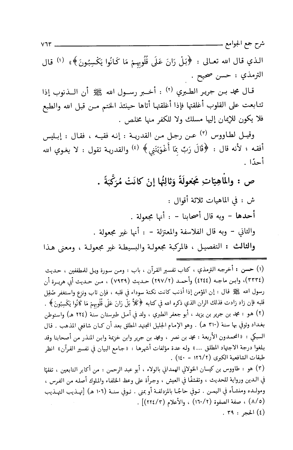 قَالَ مُحَمَّدُ بْنُ جَرِيرٍ الطَّبَرِيِّ: أَخْبَرَ رسولُ اللَّهِ- صَلَّى اللَّهُ عَلَيْهِ وسَلَّمَ- أَنَّ الذّنوبَ إِذَا تَتَابَعَتْ علَى القلوبِ أَغْلَقَتْهَا فإِذَا أَغْلَقَتْهَا أَتَاهَا حِينَئِذٍ الخَتْمُ مِنْ قِبَلِ اللَّهِ وَالطَّبْعِ، فَلاَ يَكُونُ لِلإِيمَانِ إِليهَا مَسلكٌ ولاَ لِلكُفْرِ مِنْهَا مُخَلِّصٌ.
