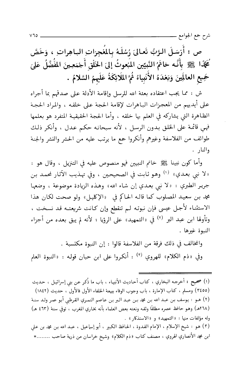 وأَمَّا كَوْنُ نَبِيِّنَا- صَلَّى اللَّهُ عَلَيْهِ وسَلَّمَ- خَاتِمَ النّبِيِّينَ فَهو منصوصٌ عَلَيْهِ فِي التّنزيلِ، وقَالَ هو: (لاَ نَبِيَّ بَعْدِي) وهو ثَابِتٌ فِي الصّحيحَيْنِ، وفِي تَهْذِيبِ الآثَارِ لِمُحَمَّدِ بْنِ جَرِيرٍ الطَّبَرِيِّ: ((لاَ نَبِيَّ بَعْدِي/ (٢٣٨/أَ/م) إِنْ شَاءَ اللَّهُ))، وهذه الزّيَادةُ موضوعةٌ، وَضَعَهَا مُحَمُّدُ بْنُ سَعِيدٍ المَصْلُوبُ كَمَا قَالَهُ الحَاكِمُ فِي (الإِكْلِيلِ) ولَوْ صَحَّتْ لَكَانَ هذَا الاستثنَاءُ لأَجْلِ عيسَى فإِنَّ نُبُوَّتَهُ لَمْ تَنْقُطْ، وإِنْ كَانَتْ شريعتُه قَدْ نُسِخَتْ، وتأَوَّلَهَا ابْنُ عبدِ البَرِّ فِي (التَّمْهِيدِ) علَى الرّؤْيَا؛ لأَنَّهُ لَمْ يَبْقَ بَعْدَه مِنْ أَجزَاءِ النّبُوَّةِ غيرِهَا.