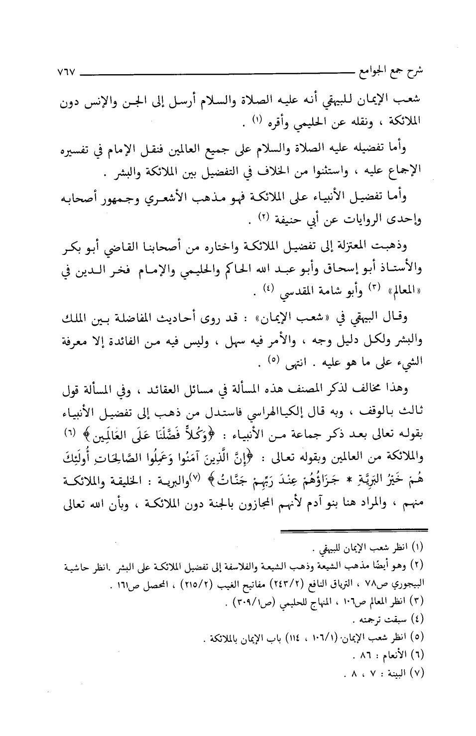 وقَالَ البَيْهَقِيُّ فِي (شُعَبِ الإِيمَانِ) قَدْ رَوى أَحَاديثَ المُفَاضلةِ بَيْنَ المَلَكِ وَالبَشَرِ ولِكُلِّ دَلِيلٍ وَجْهٌ، وَالأَمْرُ فِيهِ سَهْلٌ، وَلَيْسَ فِيهِ مِنَ الفَائِدَةِ إِلاَّ معرفةَ الشّيْءِ علَى مَا هو عَلَيْهِ، انْتَهَى.