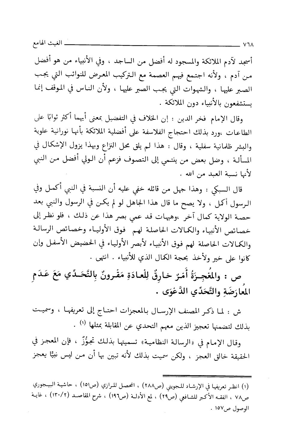 ص: وَالمُعْجِزَةُ أَمرٌ خَارقٌ لِلعَادةِ مَقرونٌ بِالتحدِّي مَعَ عدمِ المُعَارضَةِ وَالتحدي الدّعوَى.