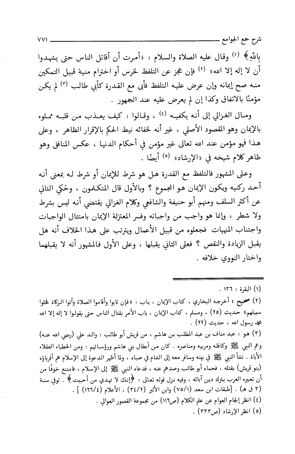 وعلَى المشهورِ فَالتَّلَفُّظُ مَعَ القدرةِ هَلْ هو شَرْطٌ لِلإِيمَانِ أَو شَرْطٌ لَهُ بِمعنَى أَنَّهُ أَحَدُ رُكْنَيْهِ، ويكونُ الإِيمَانُ هو المجموعُ؟ وبِالأَوَّلِ قَالَ المُتَكَلِّمُونَ، وحُكِيَ الثَّانِي عَن أَكثرِ السَّلَفِ، وَمِنْهُم أَبُو حَنِيفَةَ وَالشَّافِعِيُّ، وكلاَمُ الغَزَالِيِّ يَقْتَضِي أَنَّهُ لَيْسَ بِشَرْطٍ ولاَ شَطْرٍ، وإِنَّمَا هو وَاجبٌ مِنْ وَاجبَاتِه، وفَسَّرَ المُعْتَزِلَةُ الإِيمَانَ بَامتثَالِ الوَاجبَاتِ، وَاجتنَابِ المَنْهِيَّاتِ؛ فَجَعَلُوه مِنْ قَبِيلِ الأَعمَالِ، ويَتَرَتَّبُ علَى هذَا الخِلاَفِ أَنَّهُ هَلْ يَقْبَلُ الزّيَادةَ وَالنَقْصَ؟