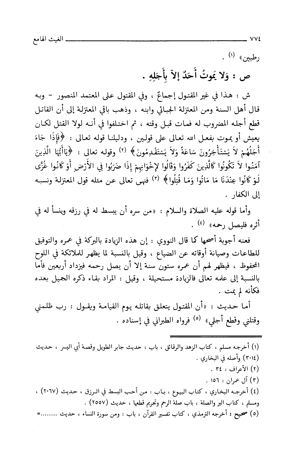 ش: هذَا فِي غَيْرِ المقتولِ إِجمَاعٌ، وفِي المقتولِ علَى المُعْتَمَدِ المَنْصُورِ ـ وَبِهِ قَالَ أَهْلُ السُّنَّةِ ومِنَ المُعْتَزِلَةِ الجُبَّائِيُّ وَابْنُهُ، وذَهَبَ بَاقِي المُعْتَزِلَةِ إِلَى أَنَّ القَاتلَ قَطَعَ أَجَلَهُ المَضْرُوْبَ لَهُ فَمَاتَ قَبْلَ وقتِه، ثُمَّ اخْتَلَفُوا فِي أَنَّهُ لُوْلاَ القتلُ لَكََانَ يعيشُ أَو يَمُوتُ بِفِعْلِ اللَّهِ تعَالَى علَى قولَيْنِ، ودليلُنَا قَوْلُه تعَالَى: {فإِذَا جَاءَ أَجَلُهُمْ لاَ يَسْتَأْخِرُونَ سَاعةً ولاَ يَسْتَقْدِمُونَ} وقولُه تعَالَى: {يَا أَيُّهَا الذّينَ آمَنُوا لاَ تَكُونُوا كَالَّذِينَ كَفَرُوا وقَالُوا لإِخوَانِهِمْ إِذَا ضَرَبُوا فِي الأَرْضِ أَو كَانُوا غُزًّى لَوْ كَانُوا عِنْدَنَا مَا مَاتُوا ومَا قُتِلُوَا} فَنَهَى تعَالَى عَنْ مِثْلِ قَوْلِ المُعْتَزِلَةِ، ونَسَبَهُ إِلَى الكُفَّارِ.