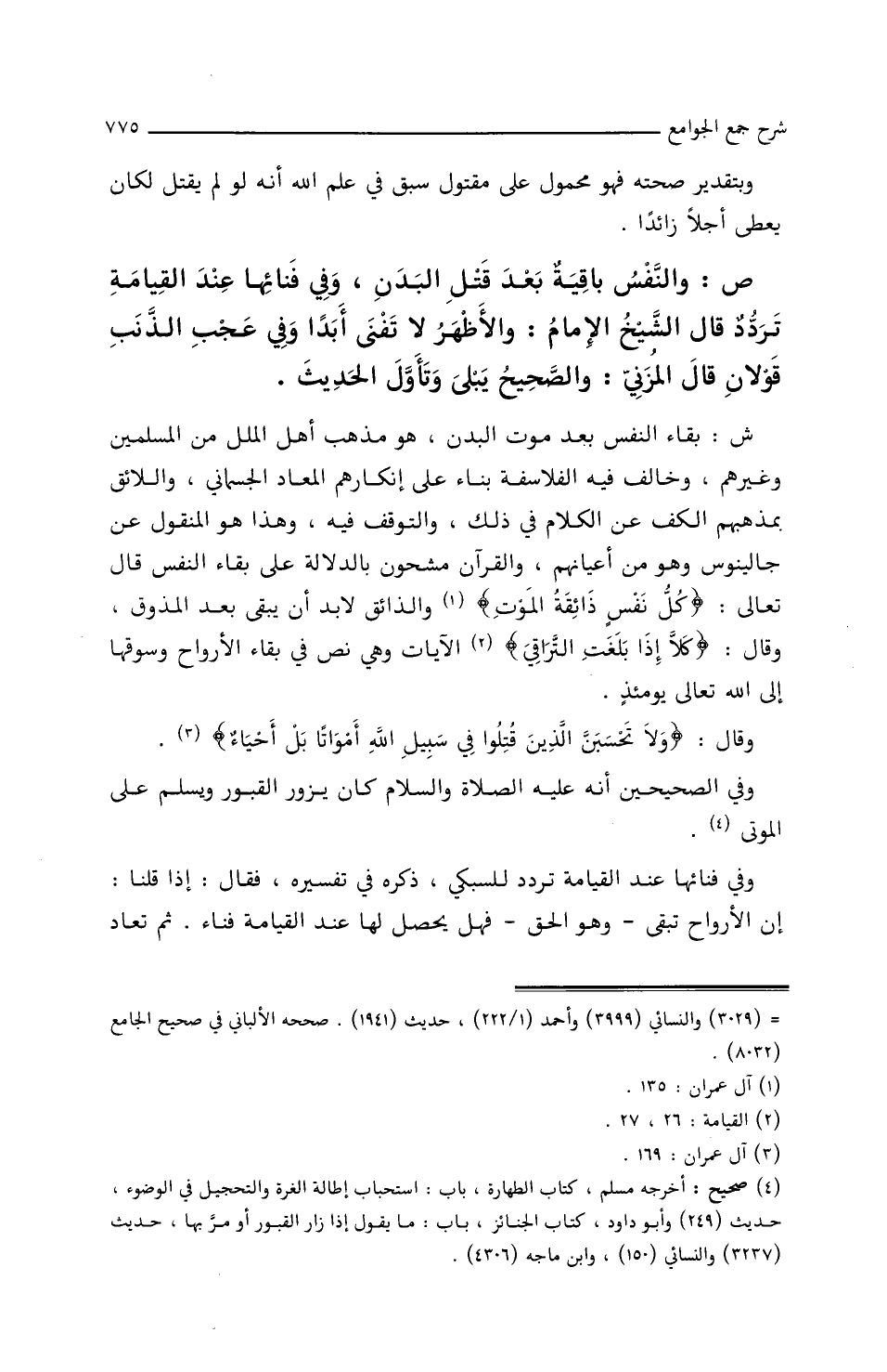 ش: بقَاءُ النَّفْسِ بَعْدَ مَوْتِ البدنِ، وهو مَذْهَبُ أَهْلِ الْمِلَلِ مِنَ المسْلِمِينَ وَغَيْرِهم، وخَالفَ فِيهِ الفلاَسفةُ بنَاءً علَى إِنكَارِهم المَعَادَ الجِسْمَانِيَّ، وَاللاَئقُ بِمَذْهَبِهم الكَفُّ عَنِ الكلاَمِ فِي ذَلِكَ وَالتَّوَقُّفُ فِيهِ، وهذَا هو المَنْقُولُ عَنْ جَالِينُوسَ وهو مِنْ أَعيَانِهم، وَالقرآنُ مَشْحُونٌ بِالدِّلاَلةِ علَى بَقَاءِ النَّفْسِ قَالَ تعَالَى: {كُلُّ نَفْسٍ ذَائِقَةُ الْمَوْتِ} وَالذَائِقُ لاَ بُدَّ أَنْ يَبْقَى بَعْدَ المَذُوقِ، وقَالَ: {كَلَّا إِذَا بَلَغَتِ التَّرَاقِي} الآيَاتُ، وهِيَ نَصٌّ فِي بَقَاءِ الأَرْوَاحِ وَسَوْقِهَا إِلَى اللَّهِ تعَالَى يَوْمَئِذٍ.