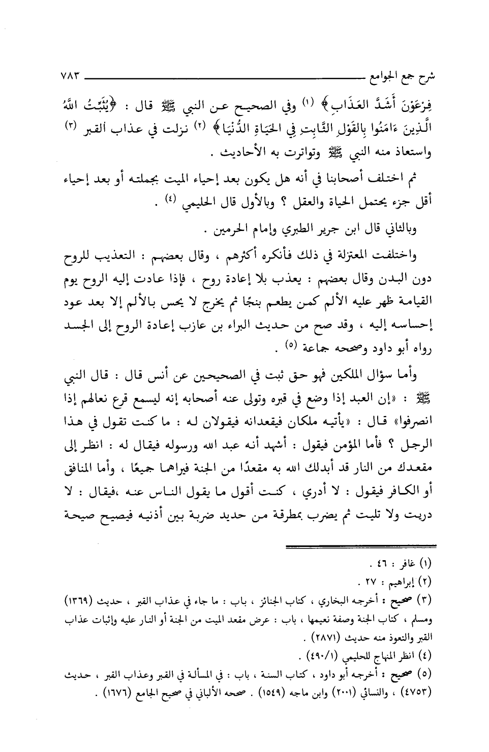 فِرْعَوْنَ أَشَدَّ الْعَذَابِ} / (٢٤٤/أَ/م) وفِي الصَّحِيحِ عَنِ النَّبِيِّ ـ صَلَّى اللَّهُ عَلَيْهِ وسَلَّمَ ـ قَالَ: {يُثَبِّتُ اللَّهُ الَّذِينَ آمَنُوا بِالقَوْلِ الثَّابِتِ فِي الْحَيَاةِ الدُّنْيَا} نَزَلَتْ فِي عذَابِ الْقَبْرِ، وَاستعَاذَ مِنْهُ النَّبِيُّ ـ صَلَّى اللَّهُ عَلَيْهِ وَسَلَّمَ ـ وتوَاترَتْ بِهِ الأَحَاديثُ.
