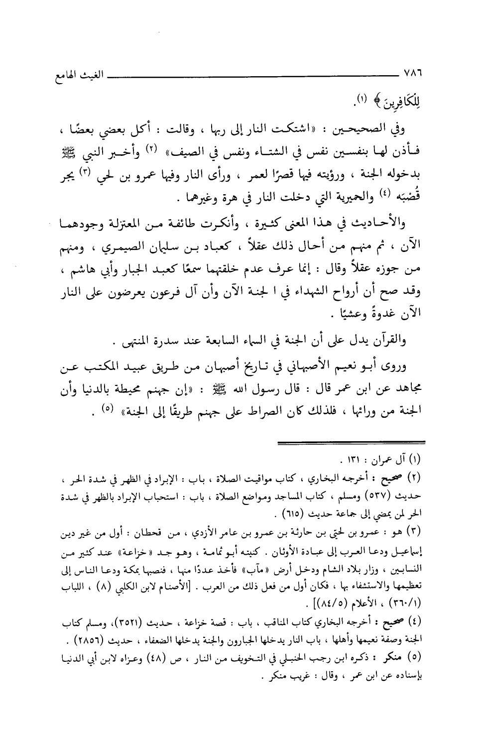 وفِي الصَّحِيحَيْنِ: ((اشْتَكَتِ النَّارُ إِلَى ربِّهَا، وقَالَتْ: أَكَلَ بَعْضِي بَعْضًا، فَأَذِنَ لَهَا بِنَفَسَيْنِ نَفَسٍ فِي الشِّتَاءِ وَنَفَسٍ فِي الصَّيْفِ)) وأَخْبَرَ النَّبِيُّ ـ صَلَّى اللَّهُ عَلَيْهِ وسَلَّمَ ـ بِدُخُولِهِ الْجَنَّةَ، ورُؤْيَتِهِ فِيهَا قَصْرًا لِعُمَرَ، وَرَأَى النَّارَ وفِيهَا عَمْرَو بْنَ لُحَيٍّ يَجُرُّ قَصَبَهُ وَالْحِمْيَرِيَّةُ التي دَخَلَتِ النَّارَ فِي هِرَّةٍ وَغَيْرِهِمَا.