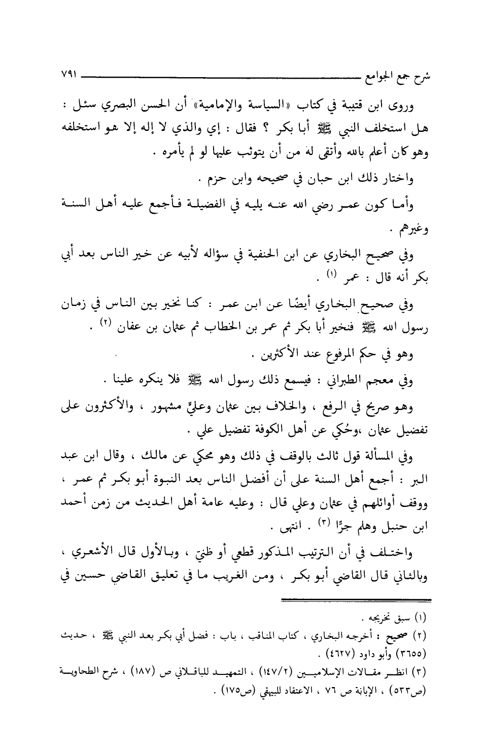 وهو صَرِيحٌ فِي الرَّفْعِ، وَالخِلاَفُ بَيْنَ عُثْمَانَ وعَلِيٍّ مشهورٌ، وَالأَكثرونَ علَى تفضِيلِ عُثْمَانَ، وحُكِيَ عَنْ أَهْلِ الْكُوفَةَ تفضِيلُ عَلِيٍّ.
