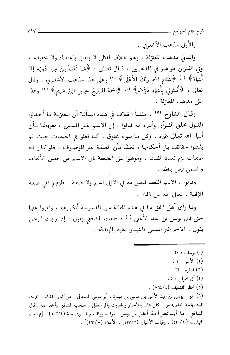 وَالثَّانِي مَذْهَبُ المُعْتَزِلَةِ، وهو خِلاَفٌ لَفْظِيٌّ لاَ يَتَعَلَّقُ بَاعتقَادٍ ولاَ بِحقيقةٍ، وفِي القرآنِ ظوَاهرٌ (٢٠٠/ب/د) فِي المَذْهَبَيْنِ، قَالَ تعَالَى: {مَا تَعْبُدُونَ مِنْ دُونِهِ إِلاَّ أَسمَاءً} {سَبَّحِ اسْمَ رَبِّكَ الأَعْلَى} وعَلَى هذَا مَذْهَبُ الأَشْعَرِيِّ، وقَالَ تعَالَى: {أَنْبِؤُونِي بأَسمَاءِ هَؤُلاَءِ} {اسْمُهُ الْمَسِيحُ عِيسَى ابْنُ مَرْيَمَ} وهذَا علَى مَذْهَبِ المُعْتَزِلَةِ.