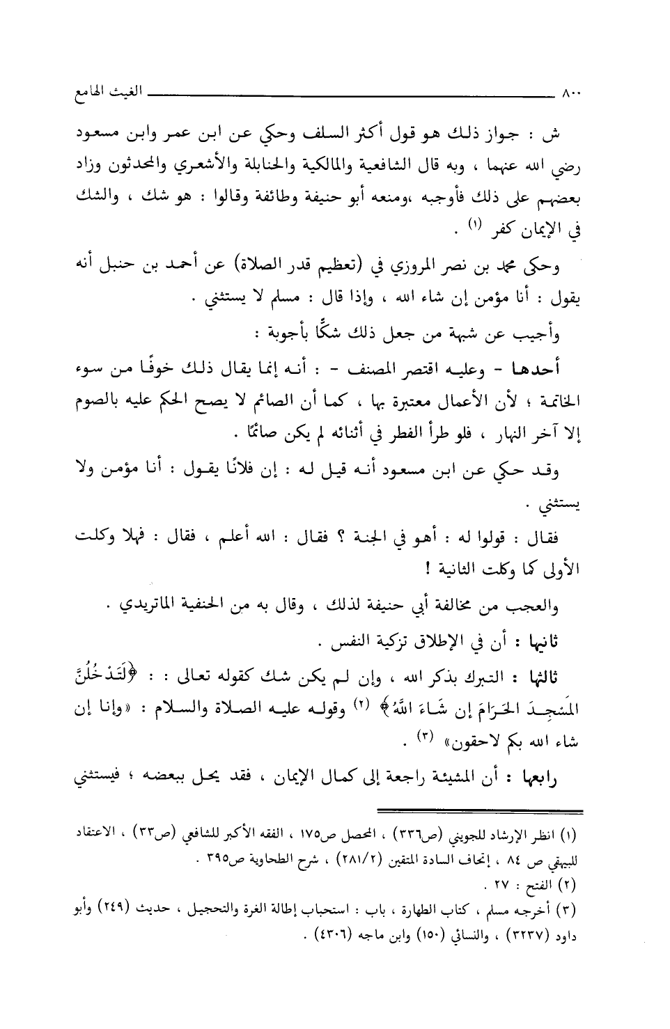 ش: جَوازُ ذَلِكَ هو قَوْلُ أَكثرِ السَّلَفِ، وحُكِيَ عَنِ ابْنِ عُمَرَ وَابْنِ مَسْعُودٍ ـ رَضِيَ اللَّهُ عَنْهُمَا ـ وَبِهِ قَالَ الشَّافِعِيَّةُ وَالمَالِكِيَّةُ وَالحَنَابِلَةُ وَالأَشْعَرِيُّ وَالْمُحَدِّثُونَ، وزَادَ بعضُهم علَى ذَلِكَ فأَوجبَهُ، ومَنَعَهُ أَبُو حَنِيفَةَ وطَائفةٌ، وقَالُوا: هو شَكٌّ، وَالشّكُّ فِي الإِيمَانِ كُفْرٌ.