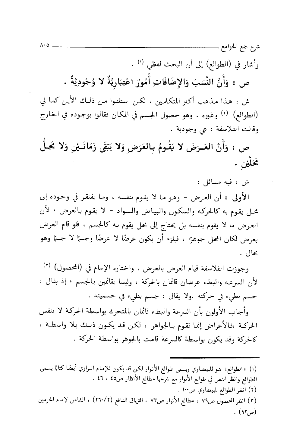 ش: هذَا مَذْهَبُ أَكْثَرِ الْمُتَكَلِّمِينَ، لَكِنِ اسْتَثْنَوا مِنْ ذَلِكَ الأَيْنَ كَمَا/ (٢٥٢/أَ/م) فِي (الطَّوَالِعِ) وَغَيْرِهِ، وهو حُصُولُ الجِسْمِ فِي المكَانِ؛ فَقَالُوا بِوُجُودِهِ فِي الْخَارِجِ، وقَالَتِ الفلاَسفةُ: هي وُجُودِيَّةٌ.