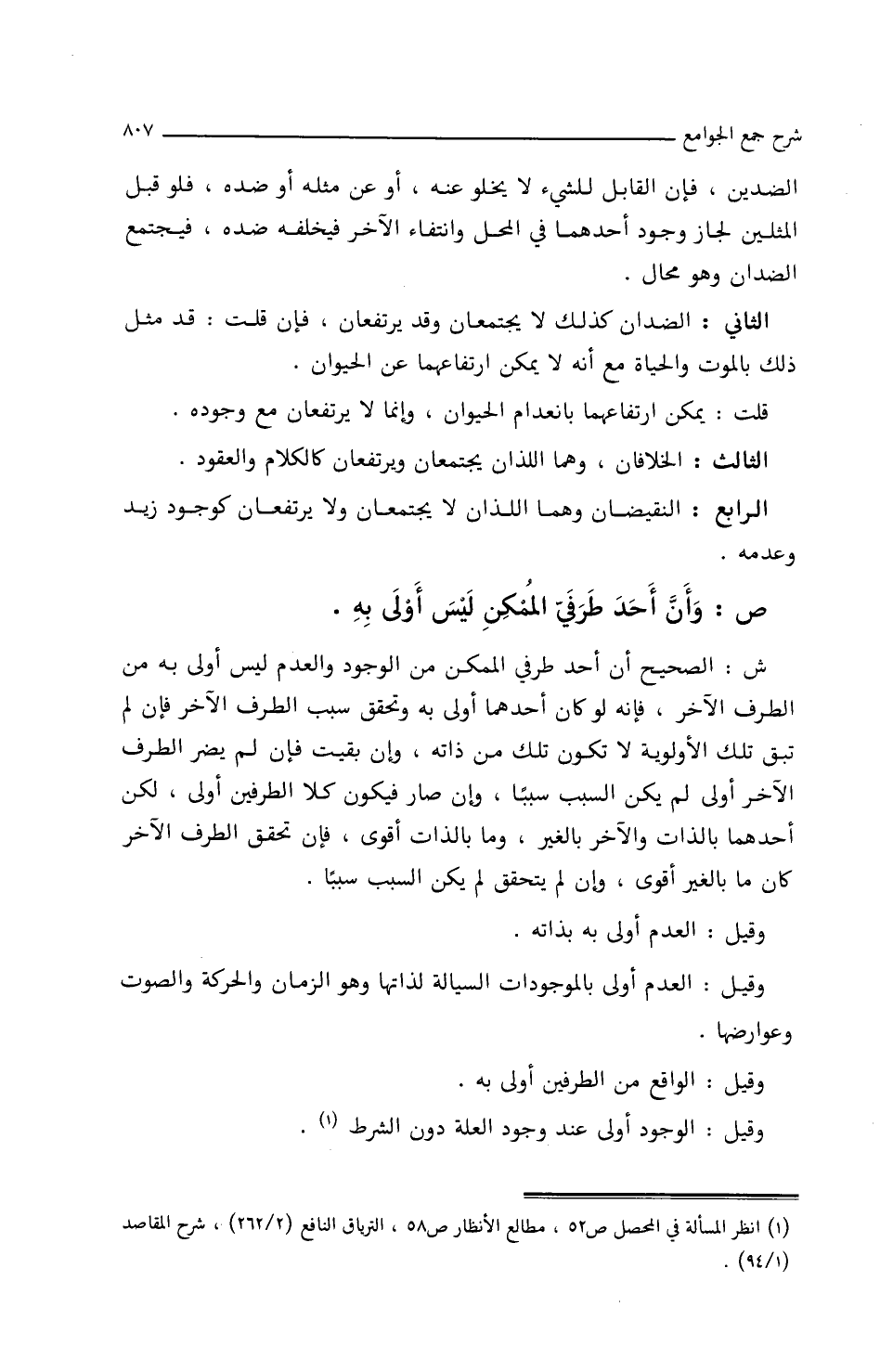 ش: الصُّحِيحُ أَنَّ أَحَدَ طَرَفِيِّ المُمْكِنِ مِنَ الوُجُودِ وَالعَدَمِ لَيْسَ أَوْلَى بِهِ مِنَ الطَّرَفِ الآخَرِ؛ فَإِنَّه لو كَانَ أَحَدُهُمَا أَوْلَى بِهِ وتَحَقَّقَ سَبَبُ الطُّرَفِ الآخَرِ؛ فَإِنْ لَمْ تَبْقَ تِلْكَ الأَوْلَوِيَّةُ لاَ تكونُ تِلْكَ مِنْ ذَاتِهِ، وإِنْ بَقِيَتْ فَإِنْ لَمْ يَضُرَّ الطَّرَفُ الآخَرُ أَوْلَى بِهِ لَمْ يكنْ السَّبَبُ سببًا، وإِنْ صَارَ فَيَكُونُ كِلاَ الطّرفَيْنِ أَوْلَى، لَكِنَّ أَحَدَهُمَا بِالذَّاتِ وَالآخَرُ بِالْغَيْرِ، ومَا بِالذَّاتِ أَقْوَى؛ فَإِنْ تَحَقَّقَ الطَّرَفُ الآخَرُ كَانَ مَا بِالْغَيْرِ أَقْوَى، وإِنْ لَمْ يَتَحَقَّقْ لَمْ يَكُنْ السَّبَبُ سَبَبًا.