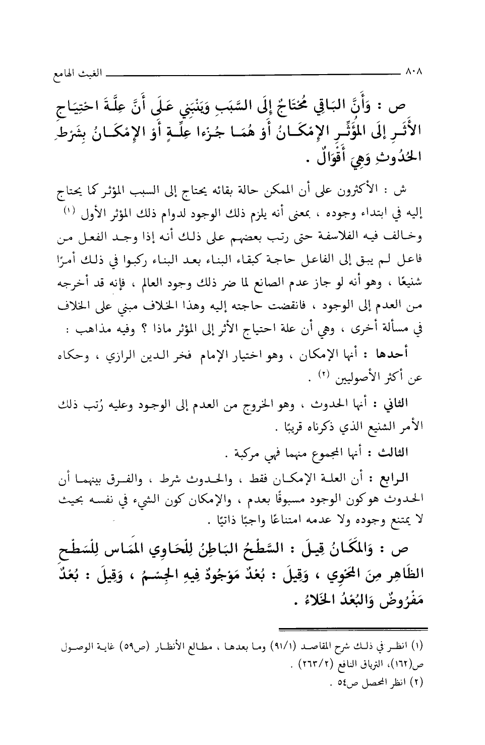 ش: الأَكثرونَ علَى أَنَّ الْمُمْكِنَ حَالةَ بَقَائِهِ يَحْتَاجُ إِلَى السَّبَبِ المُؤَثِّرِ، كَمَا يَحْتَاجُ إِلَيْهِ فِي ابتدَاءِ وُجُودِهِ، بِمَعْنَى أَنَّهُ يَدُومُ ذَلِكَ الوُجُودُ لِدَوَامِ ذَلِكَ الْمُؤَثِرِ الأَوَّلِ، وخَالَفَ فِيهِ الفَلاَسفةُ حتَّى رَتَّبَ بعضُهم علَى ذَلِكَ أَنَّهُ إِذَا وُجِدَ الفِعْلُ مِنَ الفَاعلِ لَمْ يَبْقَ إِلَى الفَاعلِ حَاجةٌ كَبَقَاءِ البِنَاءِ بَعْدَ البنَاءِ، ورَكِبُوا فِي ذَلِكَ أَمرًا شَنِيعًا، وهو أَنَّهُ لو جَازَ عَدَمُ الصَّانِعِ لَمَا ضَرَّ ذَلِكَ وُجُودُ العَالَمَ؛ فإِنَّه قَدْ أَخْرَجَهُ مِنَ العَدَمِ إِلَى الوُجُودِ، فَانْقَضَتْ حَاجَتُهُ إِلَيْهِ/ (٢٠٣/أَ/د) وهذَا الخِلاَفُ مَبْنِيٌّ علَى الخِلاَفِ فِي مسأَلةٍ أُخْرَى، وهي أَنَّ عِلَّةَ احتيَاجِ الأَثَرِ إِلَى الْمُؤَثِّرِ مَاذَا؟ وفِيه مَذَاهِبُ:
