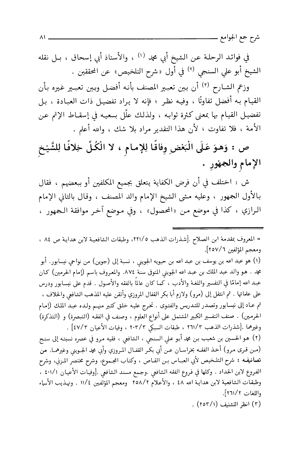 ش: اختلف في أن فرض الكفاية يتعلق بجميع المكلفين أو ببعضهم، فقال بالأول الجمهور، وعليه مشى الشيخ الإمام والد المصنف، وقال بالثاني الإمام الرازي، كذا في موضع من (المحصول) وفي موضع آخر موافقة الجمهور،