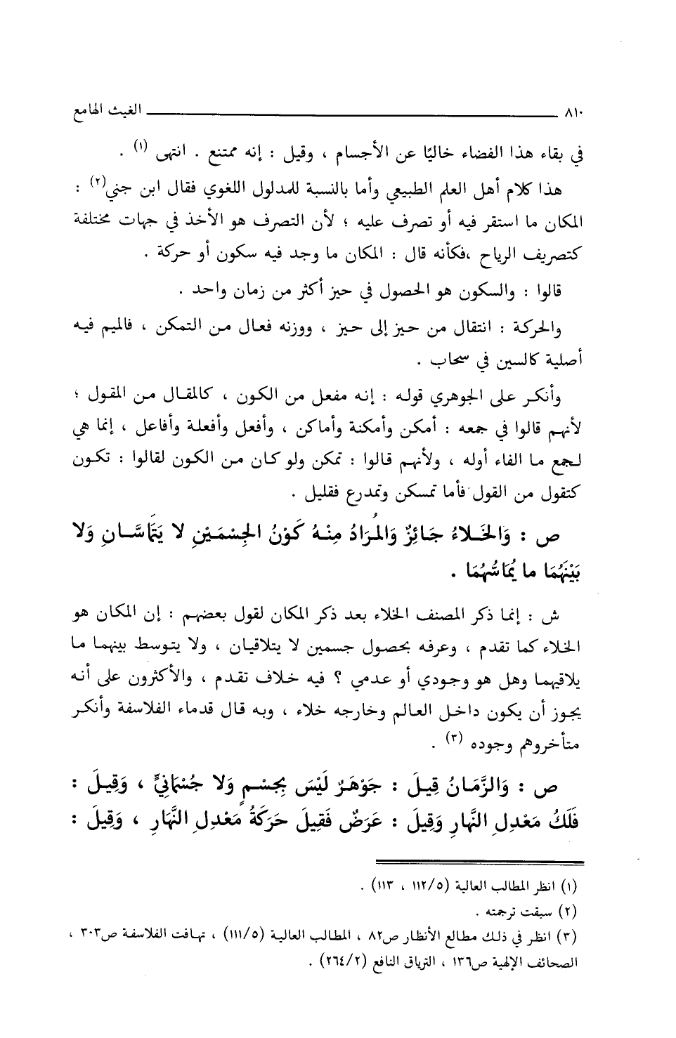 فِي بقَاءِ هذَا الفَضَاءِ خَالِيًا عَنِ الأَجْسَامِ، وَقِيلَ: إِنَّهُ مُمْتَنَعٌ. انْتَهَى.