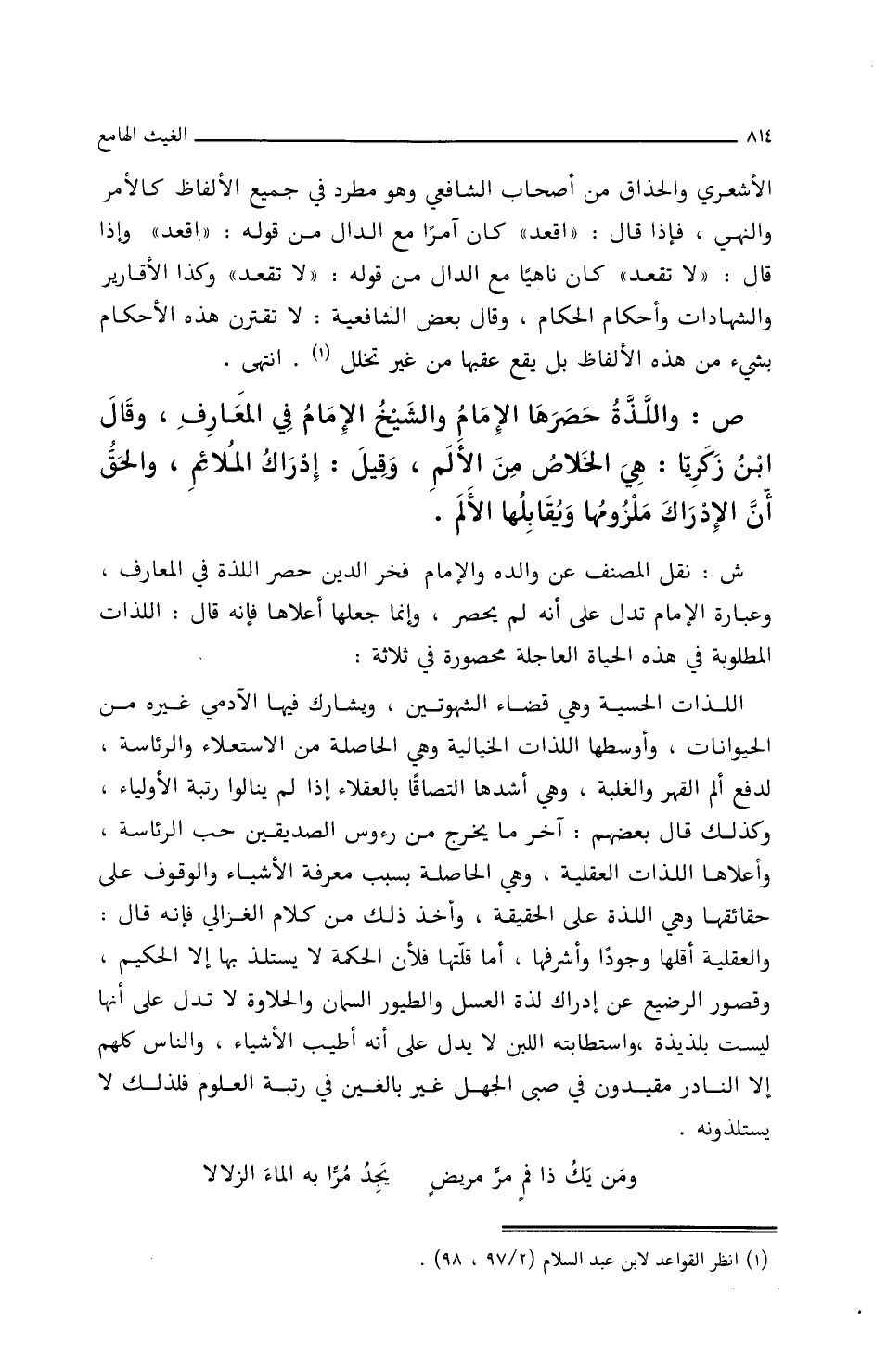 ص: وَاللَّذَّةُ حصرَهَا الإِمَامُ وَالشَّيْخُ الإِمَامُ فِي المعَارفِ، وقَالَ ابْنُ زَكَرِيَّا: هي الخلاَصُ مِنَ الأَلمِ، وَقِيلَ: إِدرَاكُ المُلاَئِمِ، وَالحقُّ أَنَّ الإِدرَاكَ مَلْزُومُهَا ويقَابلُهَا الأَلمُ.