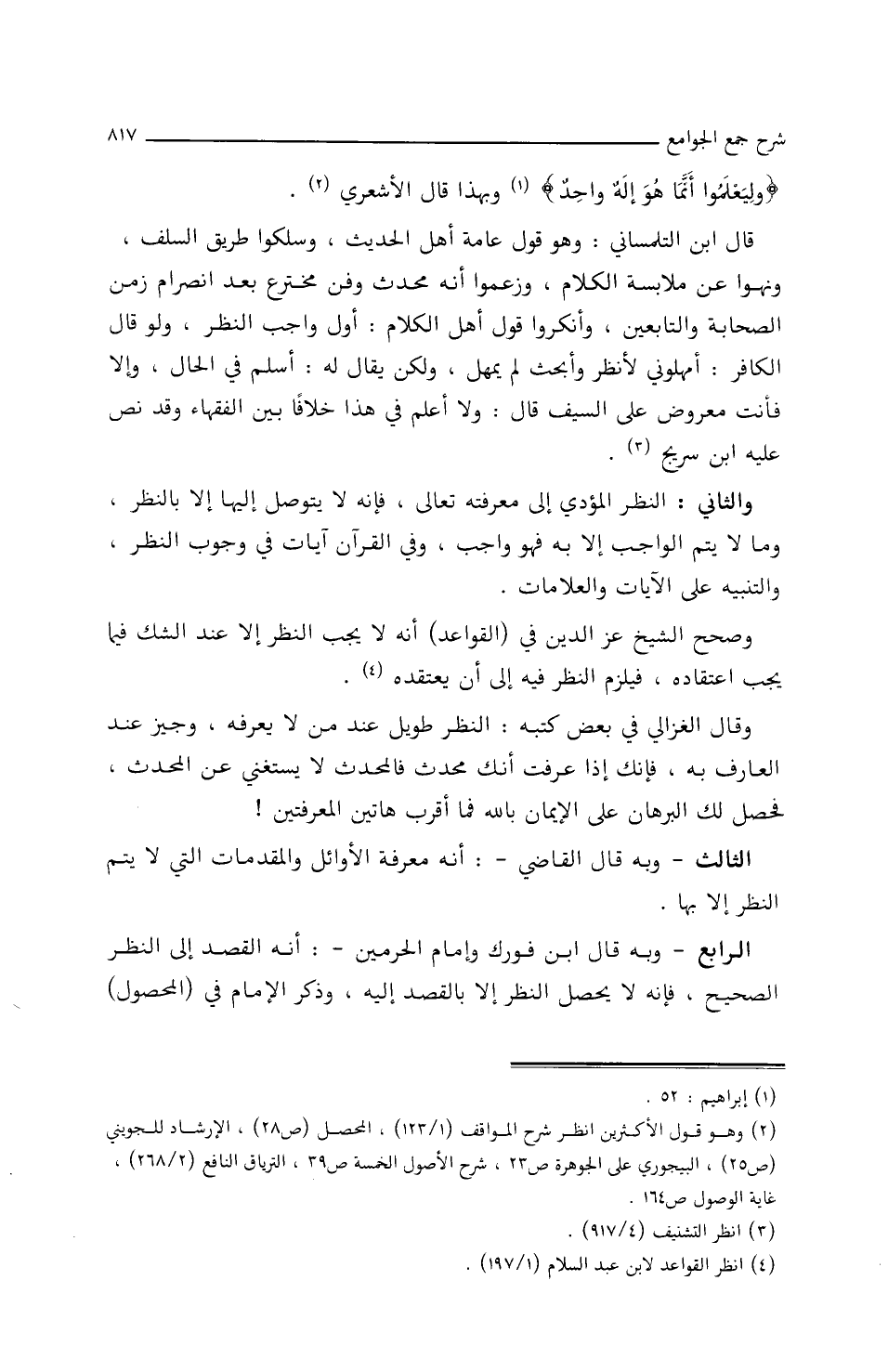 قَالَ ابْنُ التِّلْمِسَانِيُّ: وهو قَوْلُ عَامَّةِ أَهْلِ الحديثِ، وَسَلَكُوا طريقَ السَّلَفِ، وَنَهُوا عَنْ ملاَبَسَةِ الكلاَمِ، وزعَمُوا أَنَّهُ مُحْدَثٌ، (وَفَنٌّ مُخْتَرَعٌ) بعدَ انصرَامِ زَمَنِ الصّحَابةِ وَالتَابعينَ، وأَنْكَرُوا قَوْلَ أَهْلِ الكلاَمِ: أَوَّلُ وَاجبِ النّظرِ، ولو قَالَ الكَافِرُ: أَمْهِلُونِي لِأَنْظُرَ وأَبْحَثَ لَمْ يُمْهَلْ، ولكِنْ يُقَالُ له: أَسْلِمْ فِي الحَالِ، وإِلاَّ فأَنْتَ مَعْرُوضٌ علَى السّيفِ، قَالَ: ولاَ أَعْلَمُ فِي هذَا خِلاَفًا بَيْنَ الفقهَاءِ، وَقَدْ نصَّ عَلَيْهِ ابْنُ سُرَيْجٍ.