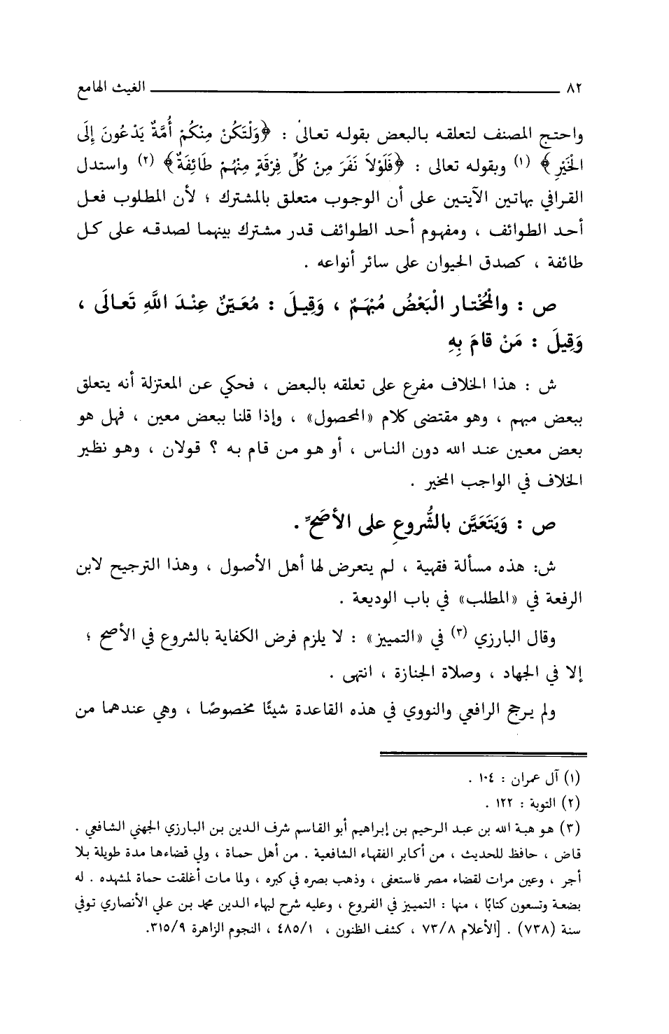 واحتج المصنف لتعلقه بالبعض بقوله تعالى: {ولتكن منكم أمة يدعون إلى الخير} وبقوله تعالى {فلولا نفر من كل فرقة منهم طائفة} واستدل القرافي بهاتين الآيتين على أن الوجوب متعلق بالمشترك، لأن المطلوب فعل أحد الطوائف، ومفهوم أحد الطوائف قدر مشترك بينهما لصدقه على كل طائفة، كصدق الحيوان على سائر أنواعه.