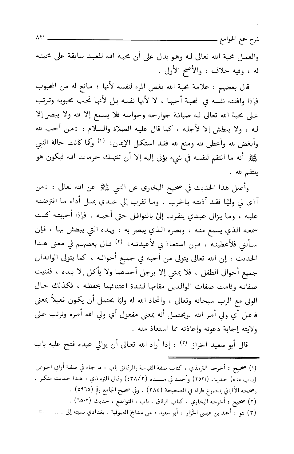 وأَصلُّ هذَا الحديثِ فِي صحيحِ البخَاريِّ عَنِ النَّبِيِّ صَلَّى اللَّهُ عَلَيْهِ وسَلَّمَ عَنِ اللَّهِ تعَالَى: ((مَنْ آذَى لِي وَلِيًّا فَقَدْ آذَنْتُه بِالْحَرْبِ، ومَا تَقَرَّبَ إِلي عَبْدِي بِمِثْلِ أَدَاءِ مَا افْتَرَضْتُه عَلَيْهِ، ومَا يزَالُ عَبْدِي يَتَقَرَّبُ إِليَّ بِالنوَافلِ حتَّى أُحِبَّهُ، فإِذَا أَحْبَبْتُهُ كُنْتُ سَمْعُهُ الذي يَسْمَعُ مِنْهُ وَبَصَرُهُ الذي يُبْصِرُ بِهِ، وَيَدُهُ الَّتِي يَبْطِشُ بِهَا، فإِنْ سأَلَنِي فَلَأُعْطِيَنَّهُ، وإِنِ اسْتَعَاذَ بِي لَأُعِيذَنَّهُ)) قَالَ بَعْضُهُم فِي معنَى هذَا الحديثِ: إِنَّ اللَّهَ تعَالَى يَتَوَلََّى مَنْ أَحَبَّهُ فِي جَمِيعِ أَحوَالِه، كَمَا يَتَوَلَّى الوَالِدَانِ جَمِيعَ أَحوَالِ الطَّفْلِ، فَلاَ يَمْشِي إِلا بِرِجْلِ أَحَدِهِمَا ولاَ يأَكلُ إِلا بِيَدِهِ، فَفَنِيَتْ صِفَاتُهُ وقَامَتْ صفَاتُ الوَالِدَيْنِ مقَامَهَا لشدَّةِ اعتنَائِهمَا بِحِفْظِهِ، فكذلك حَالُ الولِيِّ مَعَ الرَّبِّ سبحَانَه وتعَالَى، وَاتِّخَاذُ اللَّهِ لَهُ وليًّا يحتمِلُ أَنْ يَكُونَ فعيلاً بمعنَى فَاعلٍ، أَي وَلِيُّ أَمْرِ اللَّهِ.