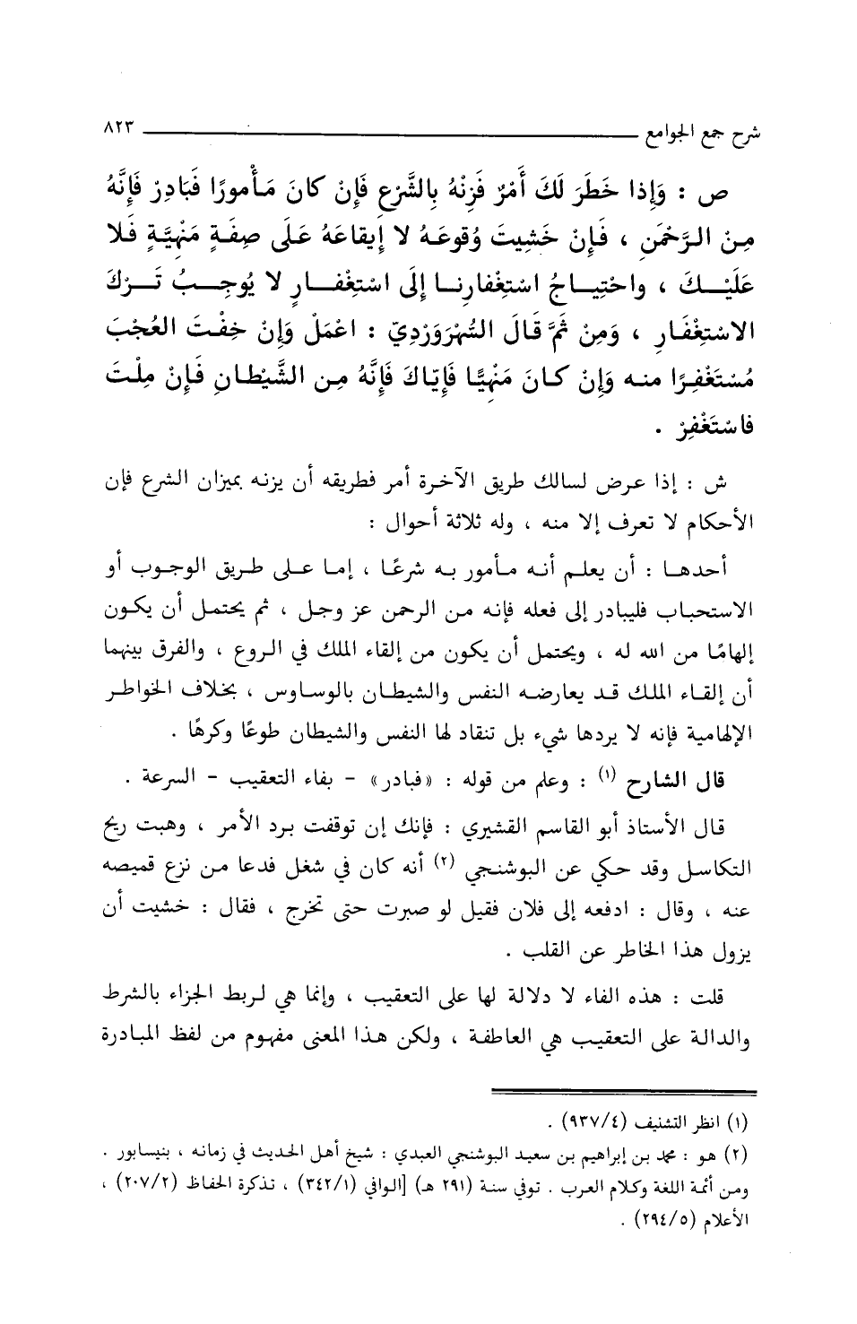 ص: وإِذَا خَطَرَ لَك أَمْرٌ فَزِنْهُ بِالشَّرْعِ فإِنْ كَانَ مأُمُورًا فبَادِرْ فإِنَّه مِنَ الرَّحْمَنِ، فإِنْ خَشِيتَ وقوعَه لاَ إِيقَاعَه علَى صفةٍ مَنْهِيَّةٍ فَلاَ عليك، وَاحْتِيَاجُ اسْتِغْفَارِنَا إِلَى اسْتِغْفَارٍ لاَ يُوجِبُ تَرْكَ الاستغفَارِ، ومِنْ ثَمَّ قَالَ السَّهْرَوَرْدِيُّ: اعْمَلْ وإِنْ خِفْتَ العُجْبَ مُسْتَغْفِرًا مِنْهُ وإِنْ كَانَ مَنْهِيًّا فإِيَّاكَ فإِنَّه مِنَ الشّيطَانِ فإِنْ مِلْتَ فَاسْتَغْفِرْ.