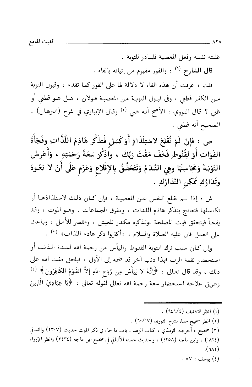 قُلْتُ: عَرَفْتَ أَنَّ هذه الفَاءَ لاَ دلاَلةَ لهَا علَى الفَوْرِ كَمَا تقدَّمَ، وقبولُ التّوبةِ/ (٢٦٠/ب/م) مِنَ الكُفْرِ قَطْعِيٌّ، وفِي قَبُولِ التَّوْبَةِ مِنَ المعصيةِ قولاَنِ، هَلْ هُوَ قَطْعِيٌّ أَيضًا أَو ظَنِيٌّ؟ قَالَ النَّوَوِيُّ: الأَصحُّ أَنَّهُ ظَنِيٌّ، وقَالَ الإِبيَاريُّ فِي شرحِ (البَرْهَانِ) الصّحيحُ أَنَّهُ قَطْعِيٌّ.