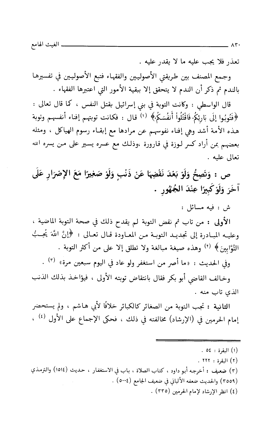 الثَانِيَةُ: تَجِبُ التّوبةُ مِنَ الصّغَائرِ كَالكبَائرِ خِلاَفًا لأَبي هَاشمٍ، ولم يَسْتَحْضِرْ إِمَامُ الحَرَمَيْنِ فِي (الإِرشَادِ) مخَالفتَه فِي ذَلِكَ، فحَكَى الإِجمَاعُ علَى الأَوَّلِ،