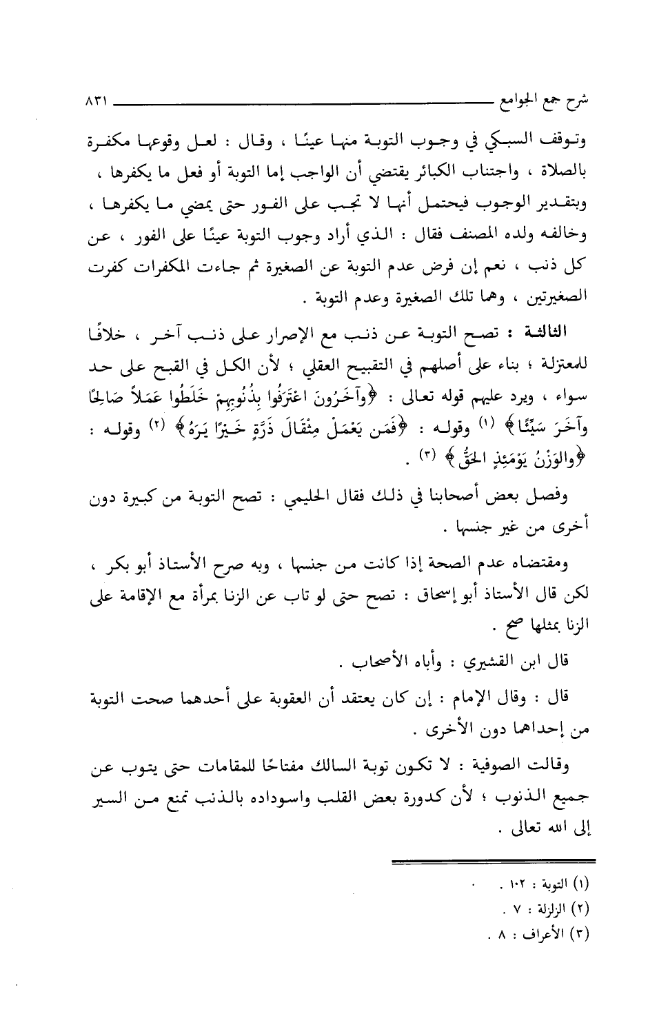 الثَالثةُ: تَصِحُّ التّوبةُ عَنْ ذَنْبٍ مَعَ الإِصرَارِ علَى ذَنْبٍ آخَرَ، خِلاَفًا للمُعْتَزِلَةِ، بنَاءً علَى أَصلِهم فِي التّقبيحِ العَقْليِّ؛ لأَنَّ الكلَّ فِي القُبْحِ علَى حدٍّ سوَاءٍ، وَيَرُدُّ عَلَيْهِم قَوْلُه تعَالَى: {وَآخَرَونَ اعْتََرَفُوا بِذُنُوبِهِمْ خَلَطُوا عَمَلًا صَالِحًا وَآخَرَ سَيِّئًا} وَقَوْلُهُ: {فَمَنْ يَعْمَلْ مِثْقَالَ ذَرَّةٍ خَيْرًا يَرَهْ} وَقَوْلُهُ: {وَالْوَزْنُ يَوْمَئِذٍ الْحَقُّ}.