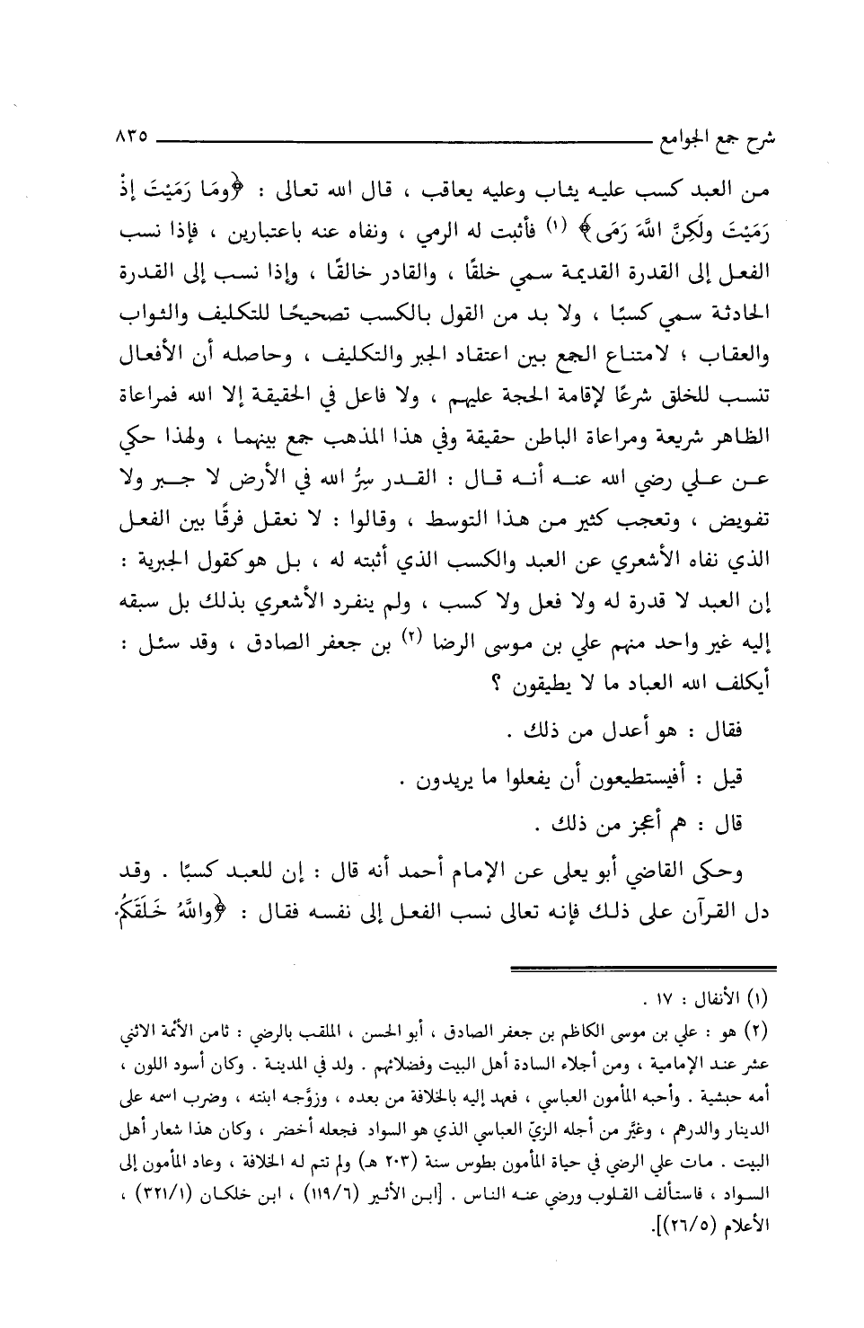 مِنَ العبدِ كَسْبٌ عَلَيْهِ يُثَابُ وعَلَيْهِ يُعَاقَبُ، قَالَ اللَّهُ تعَالَى {ومَا رَمَيْتَ إِذْ رَمَيْتَ وَلَكِنَّ اللَّهَ رَمَى} فَأَثْبَتَ لَهُ الرَّمْيَ، ونَفَاهُ عَنْهُ بِاعْتِبَارَيْنِ، فإِذَا نَسَبَ الْفِعْلَ إِلَى القدرةِ القديمةِ سُمِّيَ خَلْقًا، وَالقَادِرُ خَالِقًا، وإِذَا نَسَبَ إِلَى القدرةِ الحَادثةِ سُمِّيَ كَسْبًا، ولاَ بُدَّ مِنَ القَوْلِ بِالكَسْبِ تصحيحًا لِلتَّكْلِيفِ وَالثوَابُ وَالعِقَابُ؛ لامتنَاعِ الجَمْعِ بَيْنَ اعتقَادِ الْجَبْرِ المَحْضِ وَالتكليفِ، وحَاصِلُهُ أَنَّ الأَفعَالَ تُنْسَبُ لِلْخَلْقِ شَرْعًا؛ لإِقَامةِ الحُجَّةِ عَلَيْهِمْ، ولاَ فَاعلَ فِي الحقيقةِ/ (٢٦٣/أَ/م) إِلَّا اللَّهُ، فَمُرَاعَاةُ الظَّاهِرِ شريعةٌ، ومرَاعَاةُ البَاطِنِ حقيقيةٌ، وفِي هذَا المذهبِ جَمْعٌ بَيْنَهُمَا؛ ولِهذَا حُكِيَ عَنْ عَلِيٍّ ـ رَضِيَ اللَّهُ عَنْهُ ـ أَنَّهُ قَالَ: الْقَدَرُ سِرُّ اللَّهِ فِي الأَرْضِ، لاَ جَبْرٌ ولاَ تفويضٌ، وتَعَجَّبَ كثيرٌ مِنْ هذَا التَّوَسُّطِ، وقَالُوا: لاَ نَعْقِلُ فَرْقًا بَيْنَ الفعلِ الذي نَفَاهُ الأَشْعَرِيُّ عَنِ العبدِ وَالكسبِ الذي أَثْبَتَهُ لَهُ، بَلْ هو كَقَوْلِ الْجَبْرِيَّةِ: إِنَّ العبدَ لاَ قدرةَ لَهُ ولاَ فِعْلَ ولاَ كَسْبَ، ولم يَنْفَرِدِ الأَشْعَرِيُّ بِذَلِكَ بَلْ سَبَقَهُ إِلَيْهِ غَيْرُ وَاحِدٍ مِنْهُم عَلِيُّ بْنُ مُوسَى الرِّضَا بْنُ جَعْفَرٍ الصَّادِقُ، وَقَدْ سُئِلَ: أَيُكَلِّفُ اللَّهُ العِبَادَ مَا لاَ يَطِيقُونَ؟