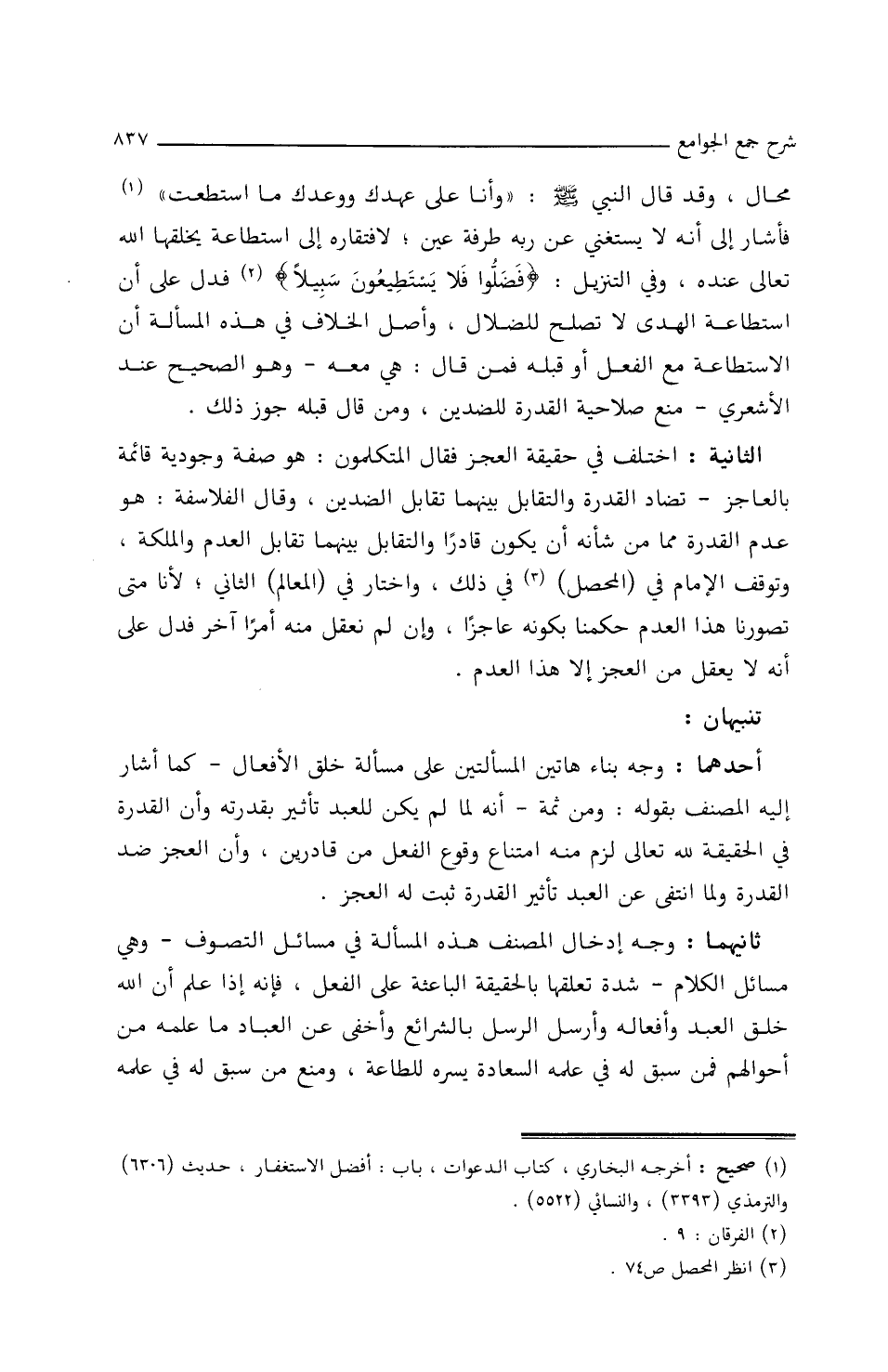 مُحَالٌ، وَقَدْ قَالَ النَّبِيُّ ـ صَلَّى اللَّه عَلَيْهِ وسَلَّمَ ـ: ((وأَنَا علَى عَهْدِكَ وَوَعْدِكَ مَا اسْتَطَعْتُ)) فأَشَارَ إِلَى أَنَّهُ لاَ يَسْتَغْنِي عَنْ رَبِّهِ طَرْفَةَ عَيْنٍ؛ لافْتِقَارِهِ إِلَى استطَاعةٍ يَخْلُقُهَا اللَّهُ تَعَالَى عِنْدَهُ، وفِي التَّنْزِيلِ {فَضَلُّوا فَلاَ يَسْتَطِيعُونَ سَبِيلاً} فَدَلَّ علَى أَنَّ استطَاعةَ الهُدَى لاَ تصلحُ لِلضلاَلِ، وأَصلُ الخِلاَفِ فِي هذه المَسْأَلَةِ أَنَّ الاستطَاعةَ مَعَ الفعلِ أَو قبلَهُ؛ فَمَنْ قَالَ: هي مَعَهُ ـ وهو الصّحيحُ عِنْدَ الأَشْعَرِيِّ ـ مَنَعَ صلاَحِيَّةَ الْقُدْرَةِ لِلضِّدَّيْنِ، ومَنْ قَالَ قَبْلَهُ، جَوَّزَ ذلكَ.