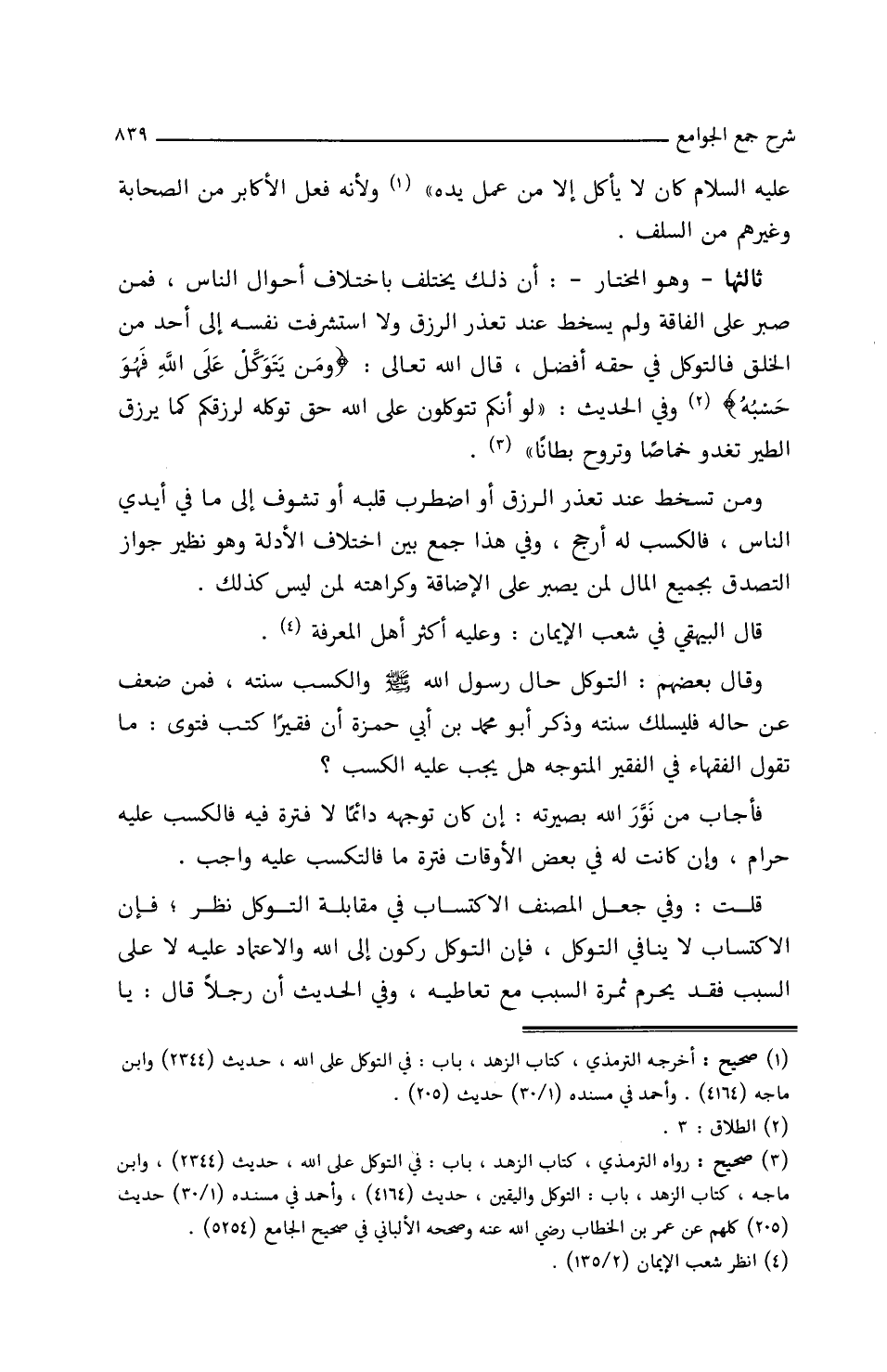 وقَالَ بعضُهم: التَّوَكُّلُ حَالُ رسولِ اللَّهِ ـ صَلَّى اللَّهُ عَلَيْهِ وسَلَّمَ ـ وَالكَسْبُ سُنَّتُهُ؛ فَمَنْ ضَعُفَ عَنْ حَالِهِ فَلْيَسْلُكْ سُنَّتَهُ، وذَكَرَ أَبُو مُحَمَّدٍ بْنُ أَبِي حَمْزَةَ أَنَّ فقيرًا كَتَبَ فَتْوَى: مَا تَقُولُ الفقهَاءُ فِي الفقيرِ الْمُتَوِجِّهِ هَلْ يَجِبُ عَلَيْهِ الْكَسْبُ؟
