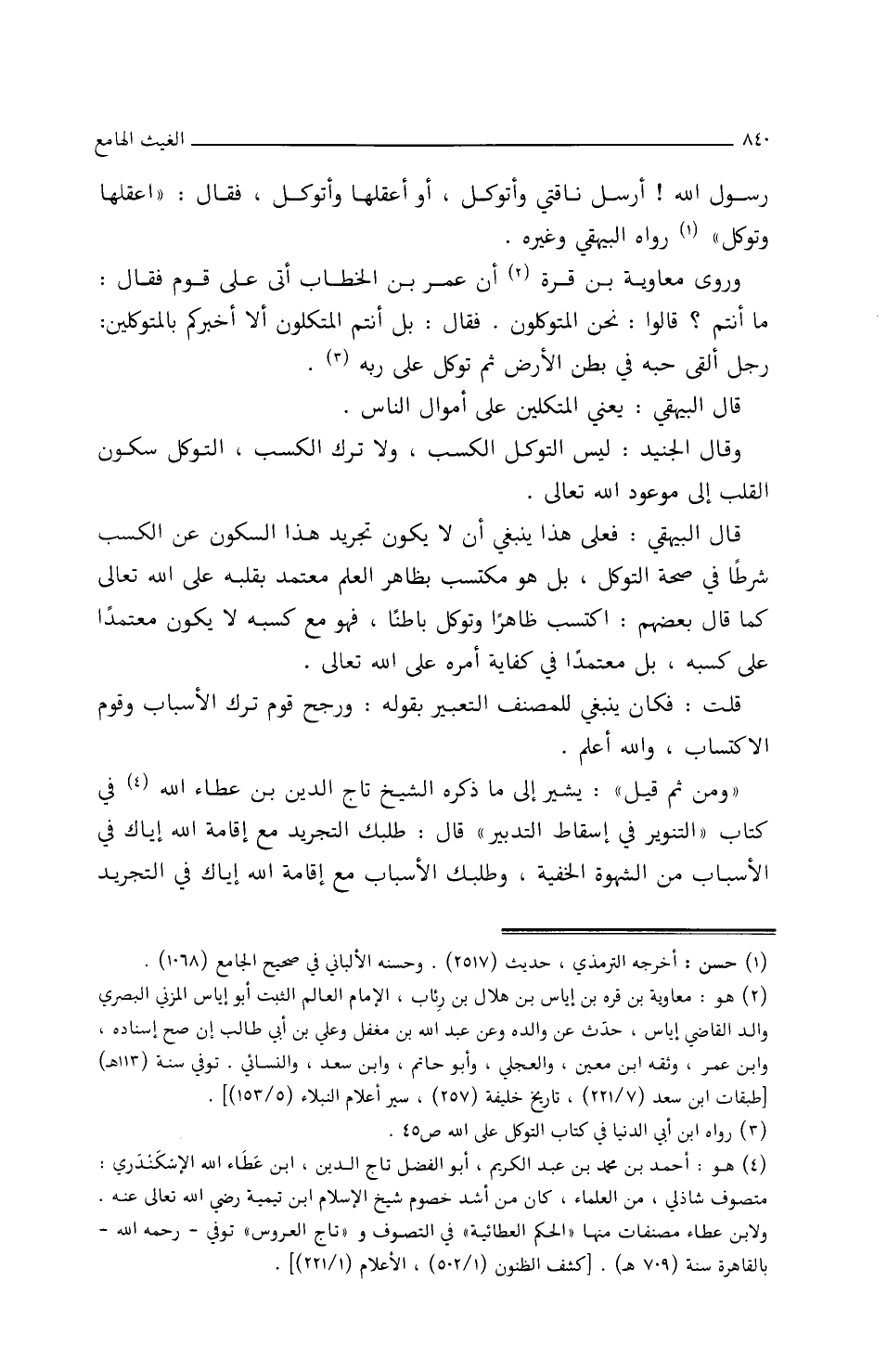 (ورَوَى معَاويةُ بْنُ قُرَّةَ) أَنَّ عُمَرَ بْنَ الْخَطَّابِ أَتَى علَى قَوْمٍ فَقَالَ: مَا أَنْتُمْ؟ قَالُوا: نَحْنُ المتوكلون. فقَالَ: بَلْ أَنتم الْمُتَّكِلُونَ، أَلاَ أَخْبِرُكُمْ بِالمتوكِّلِينَ: رَجُلٌ أَلْقَى حَبّْهَ فِي بَطْنِ الأَرضِ، ثُمَّ تَوَكَّلَ علَى ربِهِ.