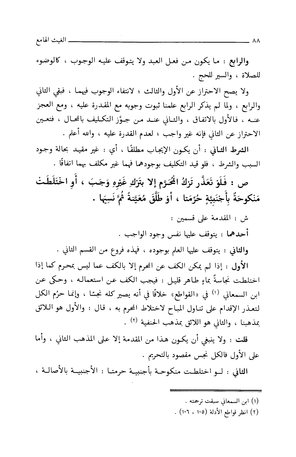 ولا يصح الاحتراز عن الأول والثالث، لانتفاء الوجوب فيهما، فبقي الثاني والرابع، ولما لم يذكر الرابع علمنا ثبوت وجوبه مع المقدرة عليه، ومع العجز عنه، فالأول بالاتفاق، والثاني عند من جوز التكليف بالمحال، فتعين/ (١٥أ/د) الاحتراز عن الثاني فإنه غير واجب، لعدم القدرة عليه، والله أعلم.