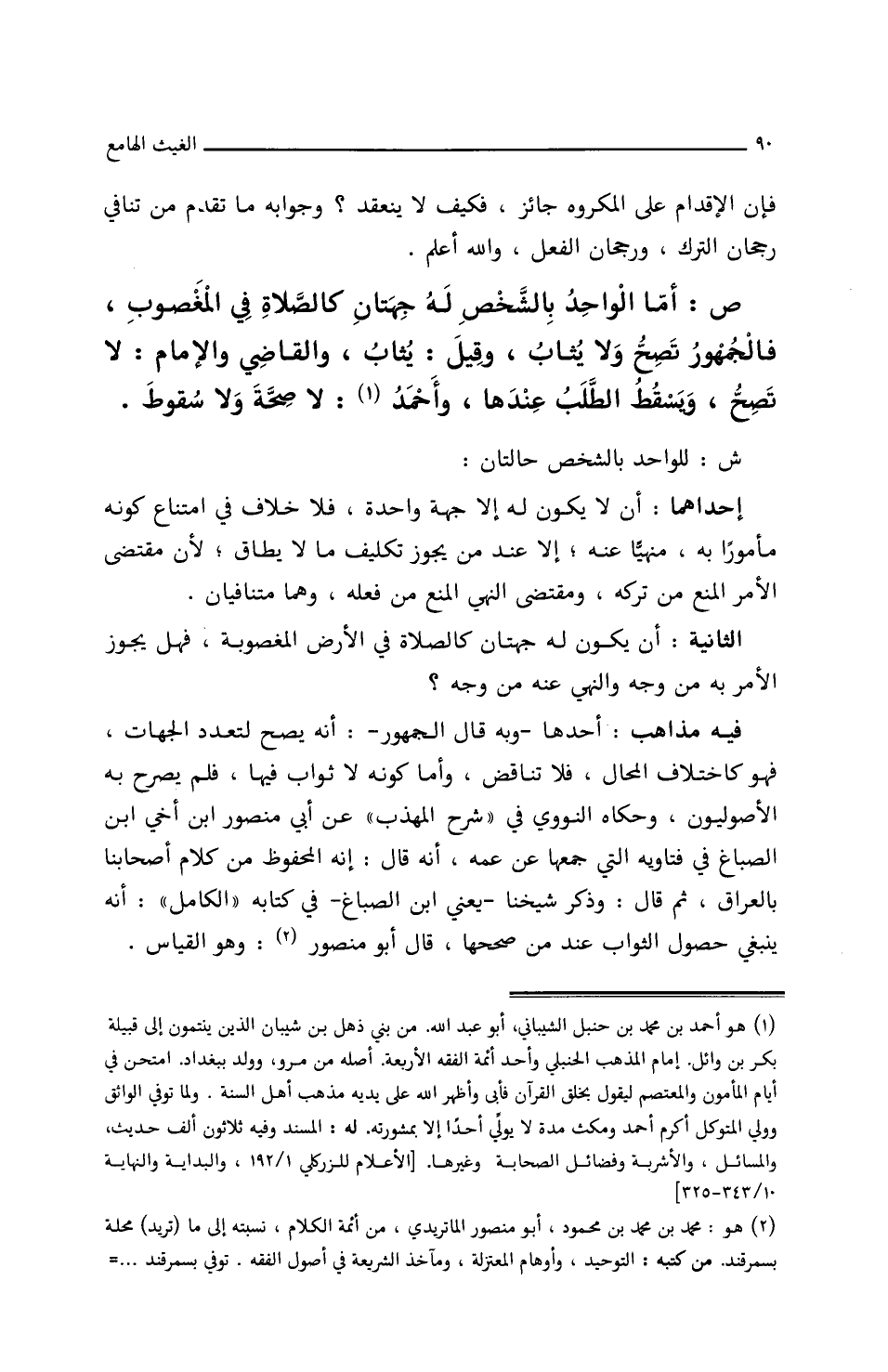 ص: أما الواحد بالشخص له جهتان كالصلاة في المغصوب، فالجمهور تصح ولا يثاب، وقيل: يثاب، والقاضي والإمام: لا تصح، ويسقط الطلب عندها، وأحمد: لا صحة ولا سقوط.