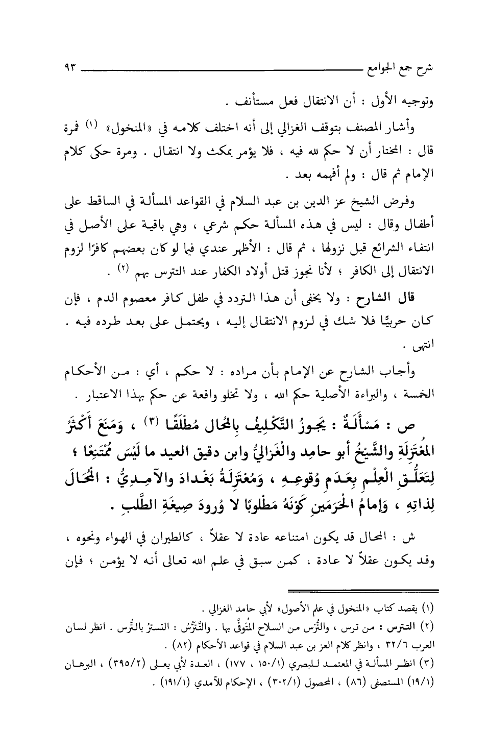 وأشار المصنف بتوقف الغزالي إلى أنه اختلف كلامه في (المنخول) فمرة قال: المختار أن لا حكم لله فيه، فلا يؤمر بمكث ولا انتقال، ومرة حكى كلام الإمام ثم قال: ولم أفهمه بعد.