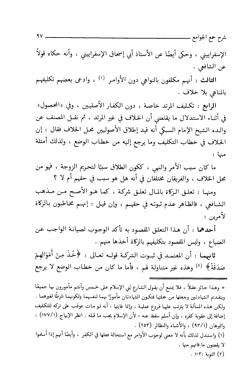 الرابع: تكليف المرتد خاصة، دون الكفار الأصليين، وفي (المحصول) في أثناء الاستدلال ما يقتضي أن الخلاف في غير المرتد، ثم نقل المصنف عن والده الشيخ الإمام السبكي أنه قيد إطلاق الأصوليين محل الخلاف فقال: إن الخلاف في خطاب التكليف وما يرجع إليه من خطاب الوضع، ولذلك أمثلة منها: