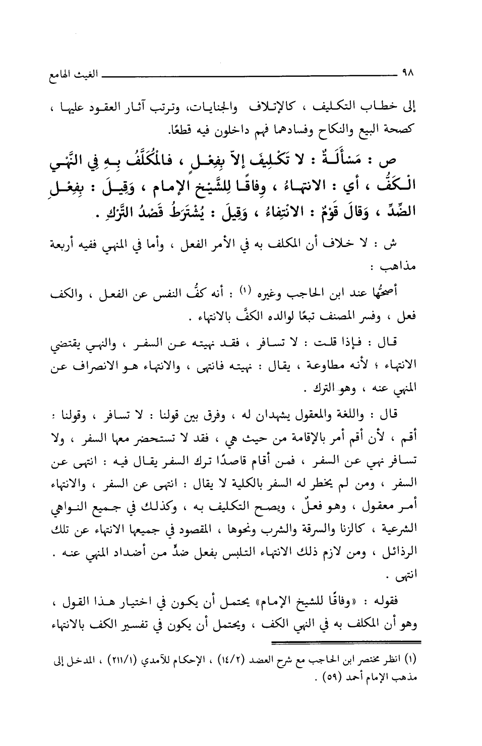 ص: مسألة: لا تكليف إلا بفعل، فالمكلف به في النهي الكف، أي: الانتهاء، وفاقاً للشيخ الإمام، وقيل: بفعل الضد، وقال قوم: الانتفاء، وقيل: يشترط قصد الترك.