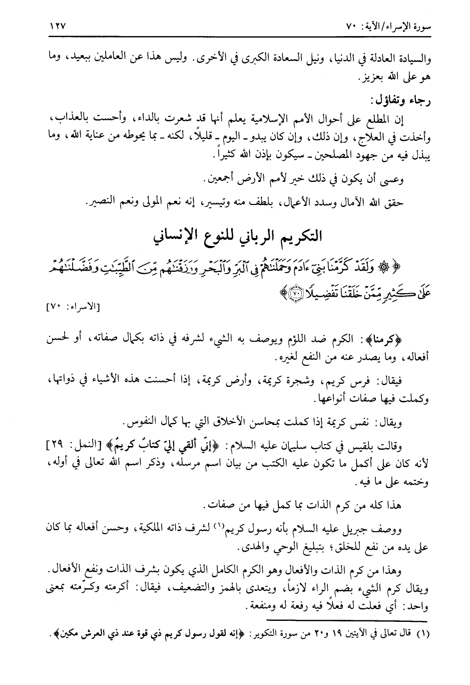 فعالم النبات أكثر حظاً في التكريم من عالم الجماد، وعالم الحيوان أكثر حظاً منهما، ونوع الإنسان أكثر حظاً في التكريم العام من جميع الحيوانات.