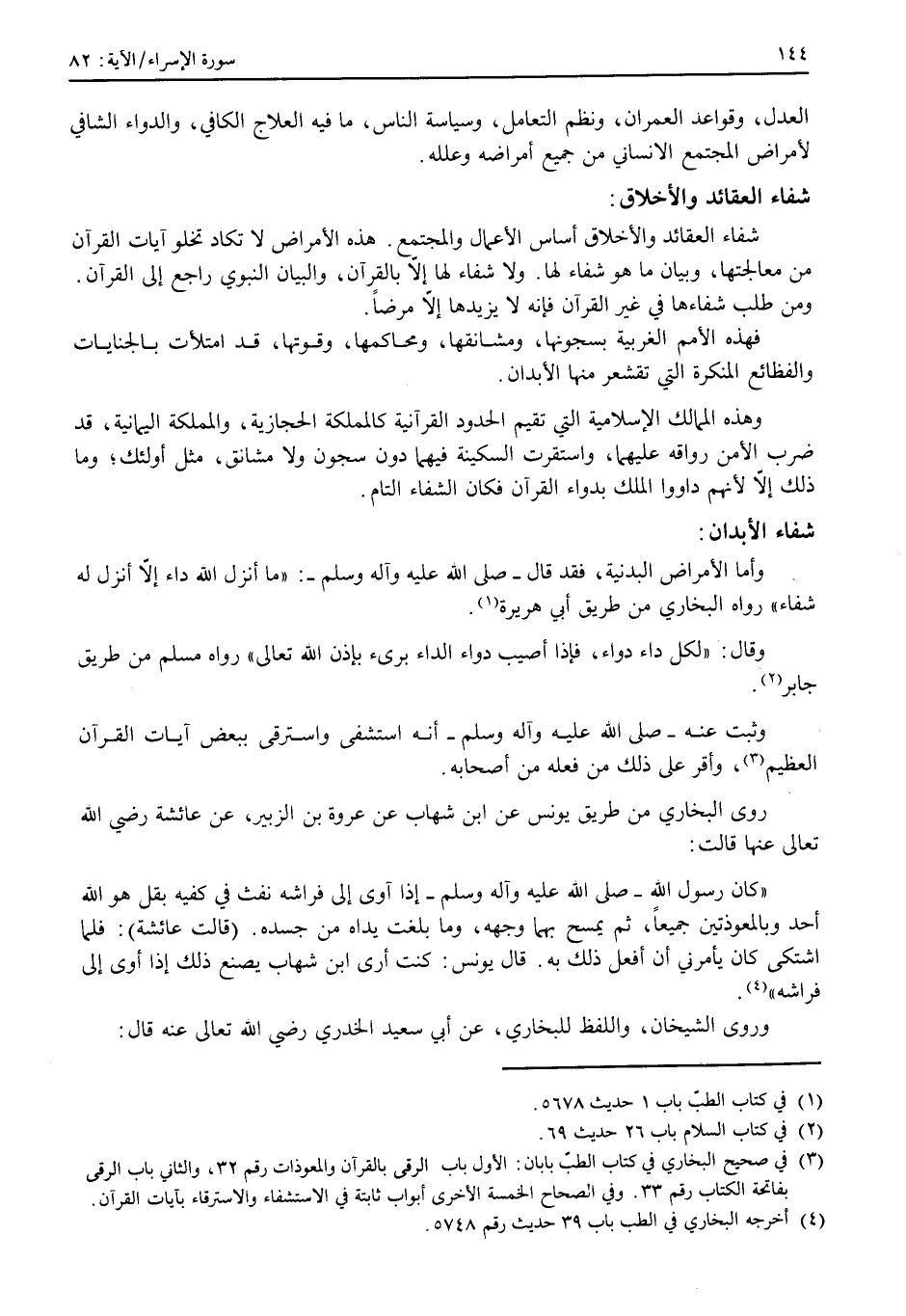وشفاء أيضاً لأبداننا؛ فنفعل كما كان يفعل النبي- صَلَّى اللهُ عَلَيْهِ وَآلِهِ وَسَلَّمَ- إذا أوى إلى فراشه، على ما تقدم في حديث عائشة رضي الله عنها وعلى ما جاء من نحو ذلك، مما ثبت عنه عليه وآله الصلاة والسلام، وانتهى إليه علمنا.