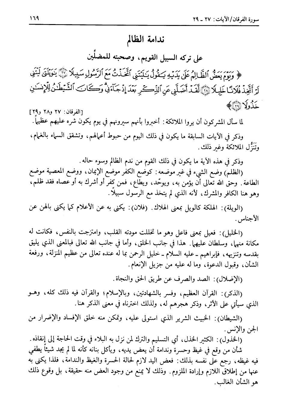 وقد ذكر لنا الله تعالى في هذه الآية ما كان من سوء مثال الظالم بسبب انقياده لخليله، واتباعه له من غير روية وصدق تمييز.