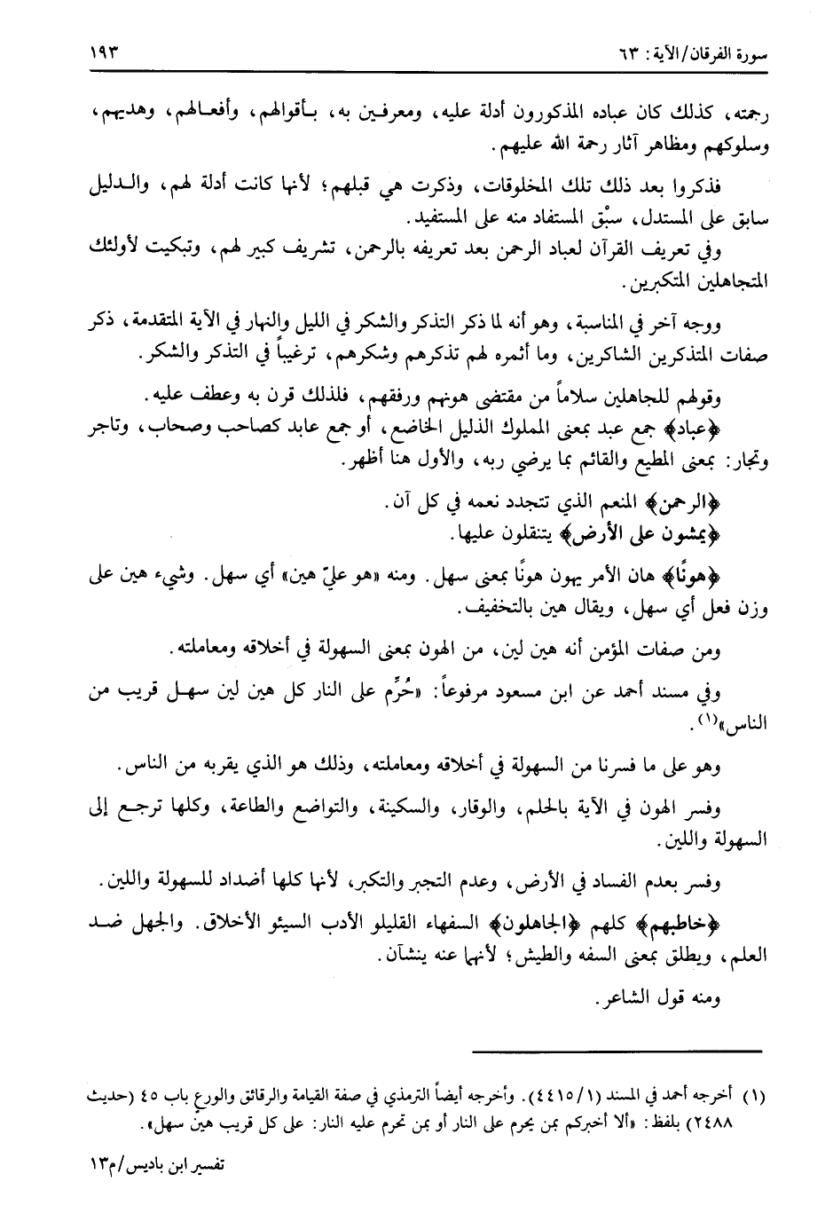 يقول تعالى: وعباد الرحمن ومماليكه القائمون بحق العبودية له، هم أهل الرفق والسهولة الذين يمشون على الأرض هينين في مشيهم، وفي معالجتهم لشؤون الحياة، ومعاملتهم للناس لحلمهم وتواضعهم، غير مستكبرين ولا متجبرين، ولا ساعين في الأرض بالفساد.