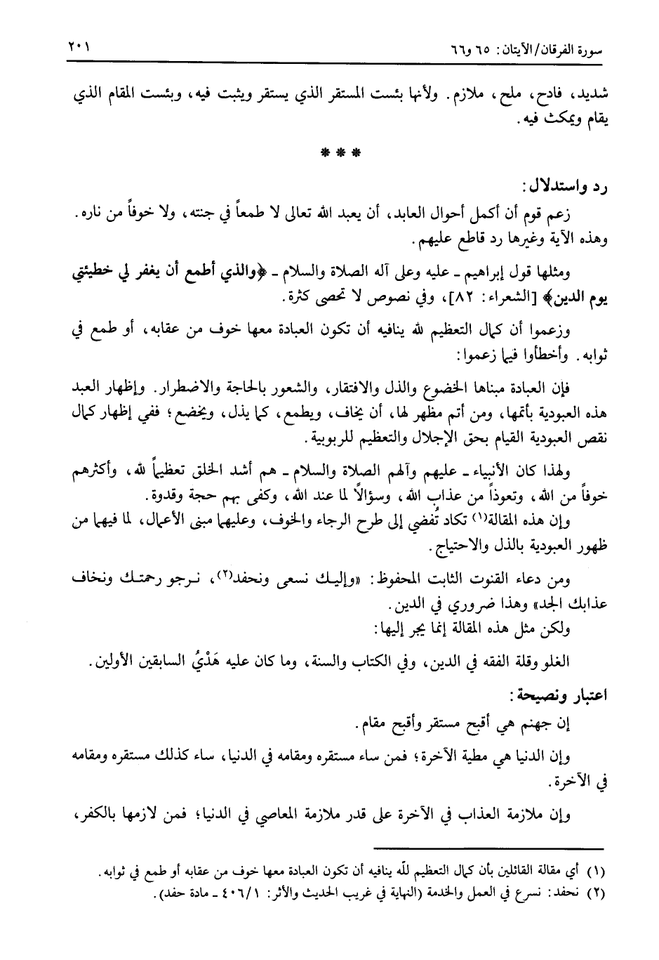 1 - فخوف العبد من عقاب ربه، هو من مقتضى اعترافه بضعفه وقوة ربه، وشهوده لعزته وقهره، وعموم تصرفه في خلقه، وأنه لا معقب لحكمه، وأنه لا يؤمن من مكروهه.