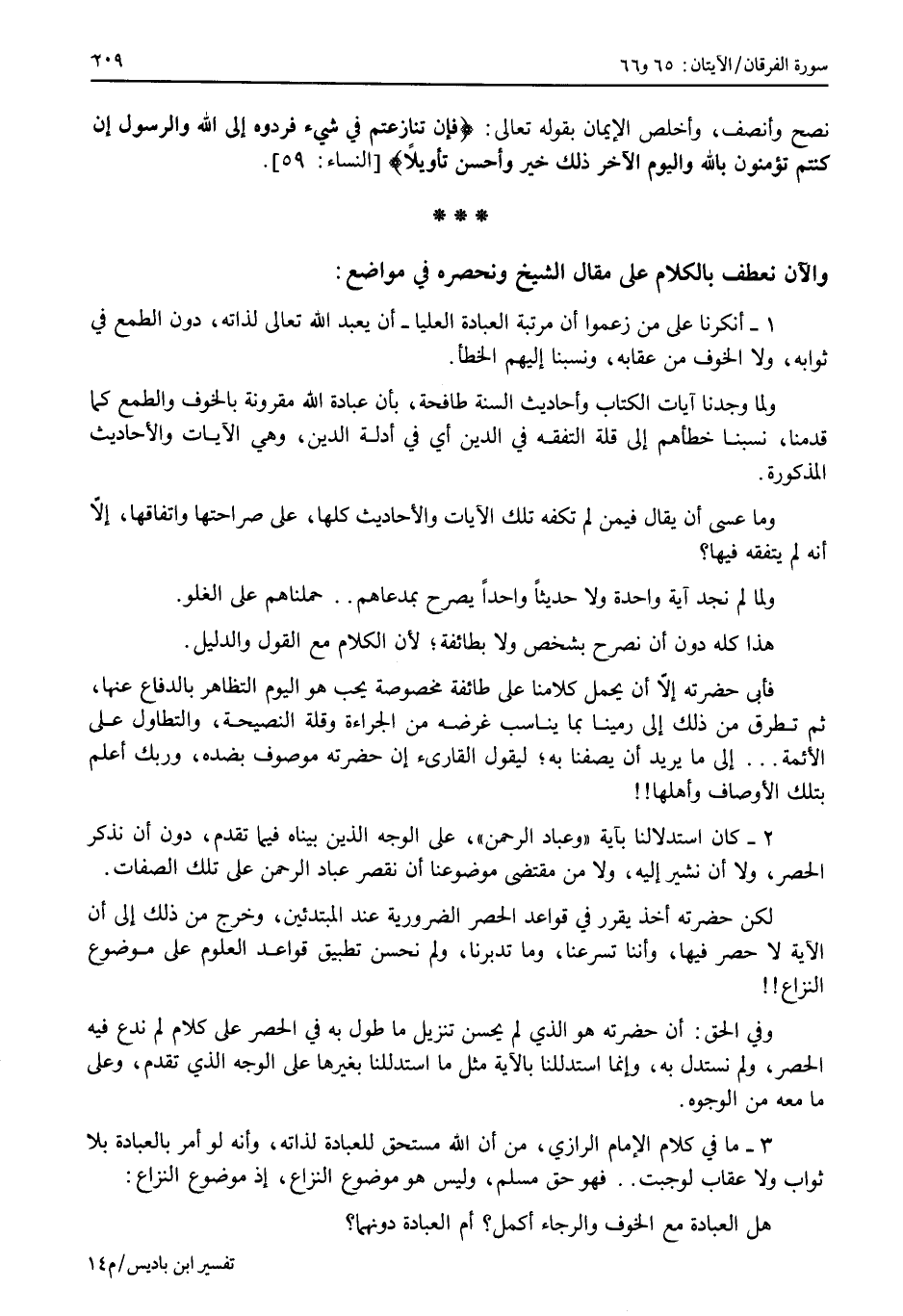 (ج) وإن أراد: أن ذكر العبد لنعم الله عليه مخل بكمال عبادته- فهذا باطل أيضاً؛ لأن عبادة الله شكرا على ما آتى من النعم، وطلبا للمزيد من أرفع المقامات. وقد قال الله تعالى: {إِنَّ إِبْرَاهِيمَ كَانَ أُمَّةً قَانِتًا لِلَّهِ حَنِيفًا وَلَمْ يَكُ مِنَ الْمُشْرِكِينَ شَاكِرًا لِأَنْعُمِهِ} [النحل: 120]. {رَبِّ أَوْزِعْنِي أَنْ أَشْكُرَ نِعْمَتَكَ} [النمل: 19]، {أَنِ اشْكُرْ لِي وَلِوَالِدَيْكَ} [لقمان: 14]، {لَئِنْ شَكَرْتُمْ لَأَزِيدَنَّكُمْ} [إبرا هيم: 7].