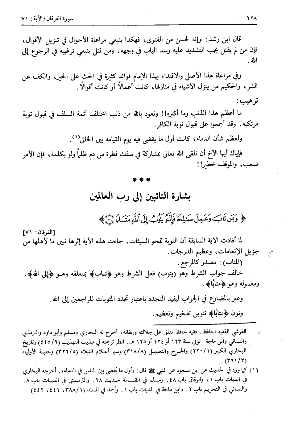 «إنهم ينفرون عن محاضر الكذابين، ومجالس الخطائين فلا يحضرونها، ولا يقربونها؛ تنزهاً عن مخالطة الشر وأهله؛ وصيانة لدينهم عما يمثله لأن مشاهدة الباطل شركة فيه.