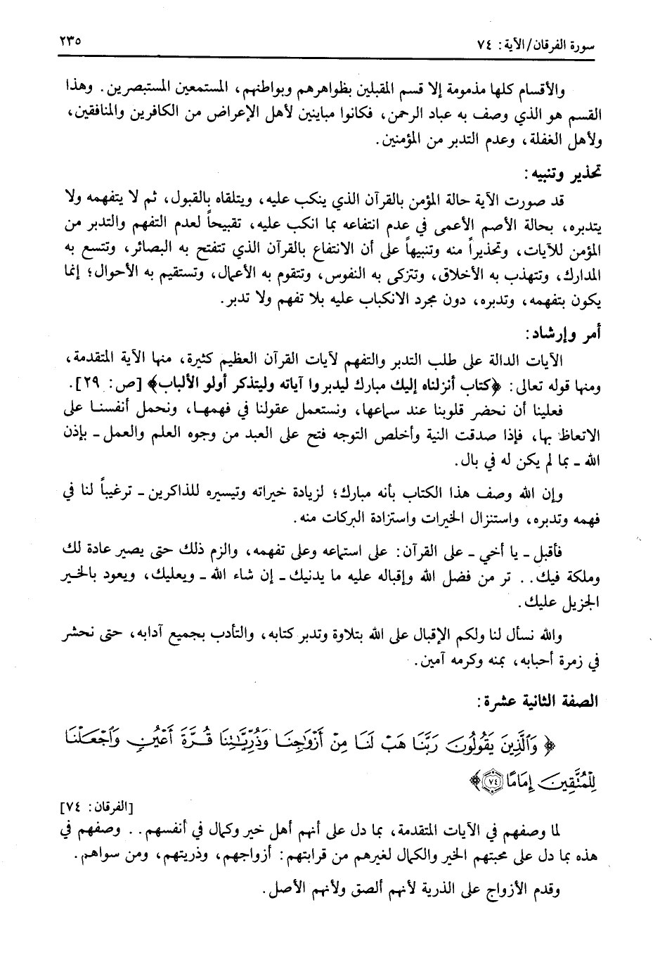 ومن صفات عباد الرحمن أنهم يدعون ربهم، يسألونه أن يهب لهم أزواجاً وذريةً، تقر بهم أعينهم، بأن يكونوا موصوفين بمثل صفاتهم سائرين على منهاجهم، معينين لهم على ما هم عليه، ويسألونه أن يكونوا على أكمل حال في العلم والعمل والاستقامة، يقتدي بهم فيها المتقون.