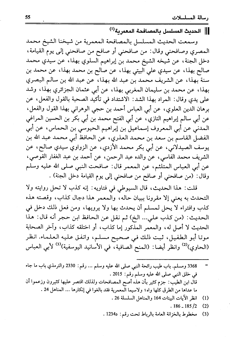 وَسَمِعْتُ الْحَدِيثَ الْمُسَلْسَلَ بِالْمُصَافَحَةِ الْمَعْمَرِيَّةِ مِنْ شَيْخِنَا الشَّيْخِ مُحَمَّدٍ الْمِصْرِيِّ وَصَافَحَنِي، وَقَالَ: مَنْ صَافَحَنِي أَوْ صَافَحَ مَنْ صَافَحَنِي إِلَى يَوْمِ الْقِيَامَةِ دَخَلَ الْجَنَّةَ، عَنْ شَيْخِهِ الشَّيْخِ مُحَمَّدِ بْنِ إِبْرَاهِيمَ السَّلَوِيِّ بِهَذَا، عَنْ سَيِّدِي مُحَمَّدٍ صَالِحٍ بِهَذَا، عَنْ سَيِّدِي عَلِيٍّ الْبَيْتِيِّ بِهَذَا، عَنْ صَالِحِ بْنِ مُحَمَّدٍ بِهَذَا، عَنْ مُحَمَّدِ بْنِ سَنَّةَ بِهَذَا، عَنِ الشَّرِيفِ مُحَمَّدِ بْنِ عَبْدِ اللَّهِ بِهَذَا، عَنْ عَبْدِ اللَّهِ بْنِ سَالِمٍ الْبَصْرِيِّ بِهَذَا، عَنْ مُحَمَّدِ بْنِ سُلَيْمَانَ الْمَغْرِبِيِّ بِهَذَا، عَنْ أَبِي عُثْمَانَ الْجَزَائِرِيِّ بِهَذَا وَقَالَ: الْمُرَادُ بِهَذَا الشَّدِّ: الاشْتِدَادُ فِي تَأْكِيدِ الصُّحْبَةِ بِالْقَوْلِ وَالْفِعْلِ، عَنْ بُرْهَانِ الدِّينِ الْعَلَوِيِّ، عَنْ أَبِي الْعَبَّاسِ أَحْمَدَ بْنِ حِجِّيٍّ الْوَهْرَانِيِّ بِهَذَا الْقَوْلِ وَالْفِعْلِ، عَنْ أَبِي سَالِمٍ إِبْرَاهِيمَ التَّازِيِّ، عَنْ أَبِي الْفَتْحِ مُحَمَّدِ بْنِ أَبِي بَكْرِ بْنِ الْحُسَيْنِ الْمَرَاغِيِّ الْمَدَنِيِّ، عَنْ أَبِي الْمَعْرُوفِ إِسْمَاعِيلَ بْنِ إِبْرَاهِيمَ الْحُيُوسِيِّ بْنِ الْحِمَاسِ، عَنْ أَبِي الْفَضْلِ الْقَاسِمِ بْنِ سَعْدِ بْنِ مُحَمَّدٍ الْعُذْرِيِّ، عَنِ الْحَافِظِ أَبِي مُحَمَّدٍ عَبْدِ اللَّهِ بْنِ يُوسُفَ الصَّيْدَلانِيِّ، عَنْ أَبِي بَكْرٍ مُحَمَّدٍ الأَزْدِيِّ، عَنِ الزَّوَاوِيِّ سَيِّدِي صَالِحٍ، عَنِ الشَّرِيفِ مُحَمَّدٍ الْفَاسِيِّ، عَنْ وَالِدِهِ عَبْدِ الرَّحْمَنِ، عَنْ أَحْمَدَ بْنِ عَبْدِ الْغَفَّارِ الْقُوصِيِّ، عَنْ أَبِي الْعَبَّاسِ الْمُتَلَثِّمِ، عَنِ الْمَعْمَرِ، قَالَ: صَافَحْتُ النَّبِيِّ صَلَّى اللَّهُ عَلَيْهِ وَسَلَّمَ، قَالَ: «مَنْ صَافَحَنِي أَوْ صَافَحَ مَنْ صَافَحَنِي إِلَى يَوْمِ الْقِيَامَةِ دَخَلَ الْجَنَّةَ» .