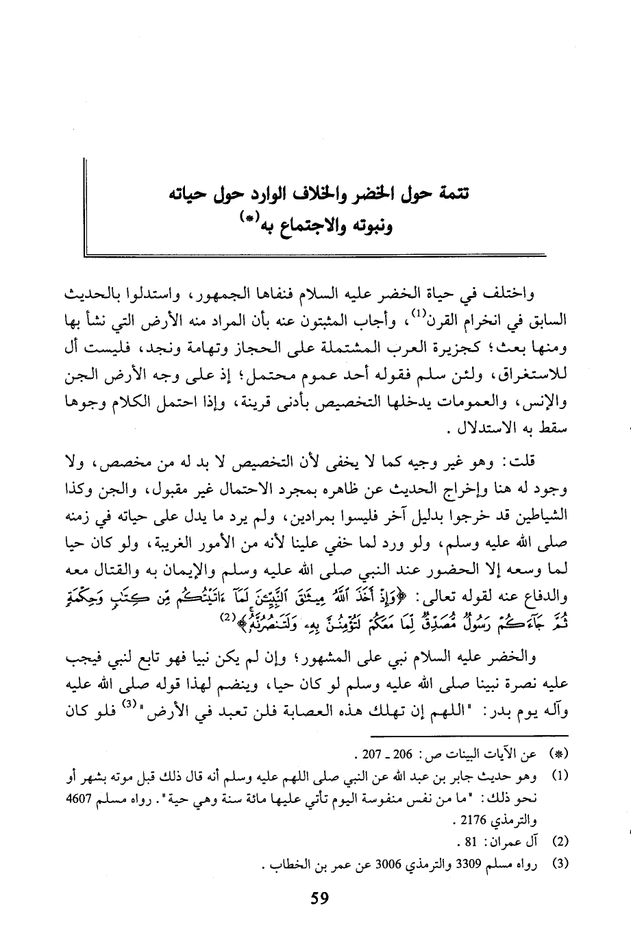 تتمة حول الخضر والخلاف الوارد حول حياته ونبوته والاجتماع بِهِ واختلف في حياة الخضر عليه السلام فنفاها الجمهور، واستدلوا بالحديث السابق في انخرام القرن، وأجاب المثبتون عَنْهُ بأن المراد منه الأرض التي نشأ بها ومنها بعث، كجزيرة العرب المشتملة على الحجاز وتهامة ونجد، فليست أل للاستغراق، ولئن سلم فقوله أحد عموم محتمل، إذ على وجه الأرض الجن والإنس، والعمومات يدخلها التخصيص بأدنى قرينة، وإذا احتمل الكلام وجوها سقط بِهِ الاستدلال.